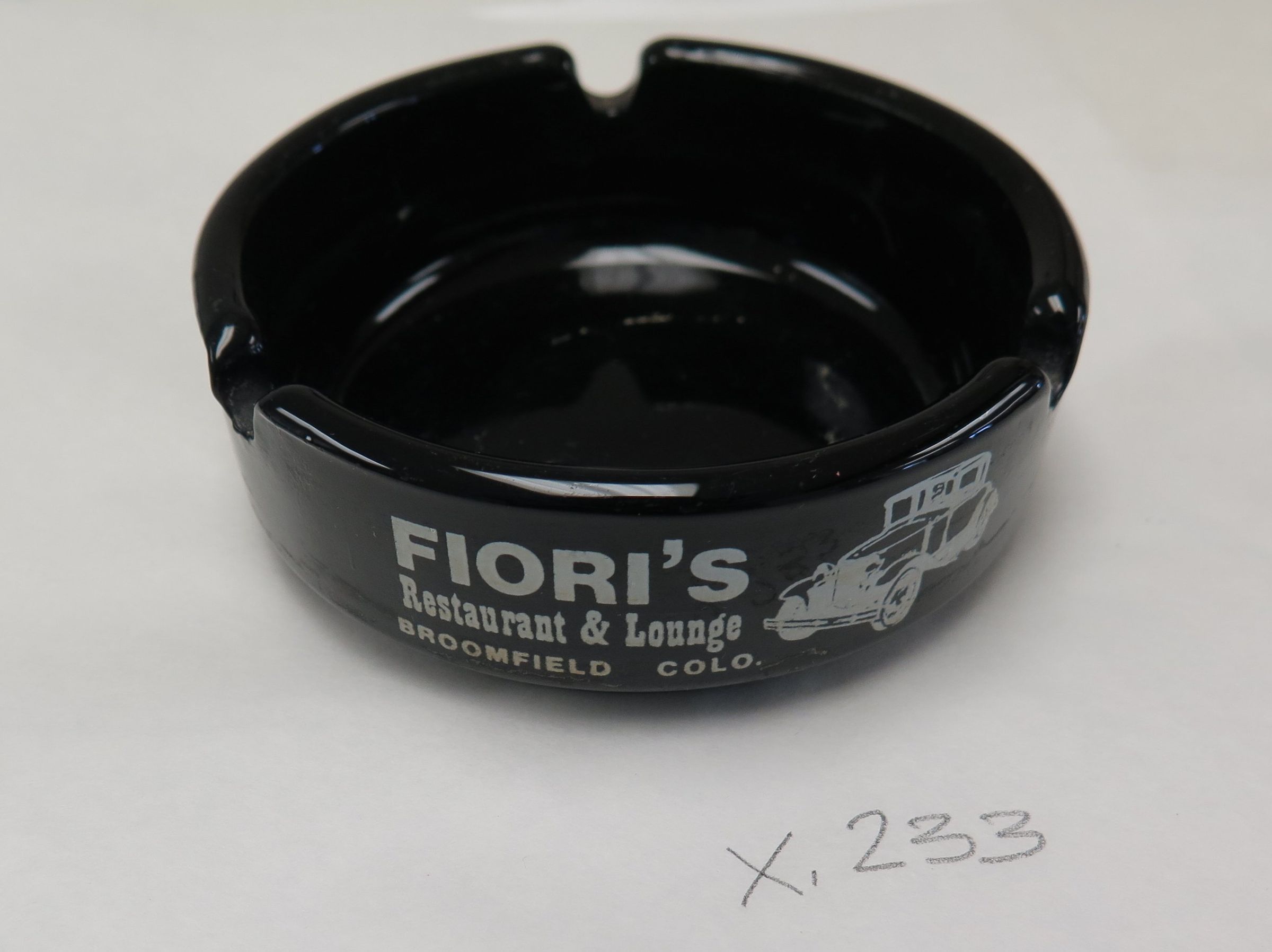 This is a round black ashtray from Fiori's. The ashtray has grey text on it written three times that reads, "Fiori's/ Restaurant & Lounge/ Broomfield Colo.". The ashtray measures 1" (h) x 3.5" (dia).Collection