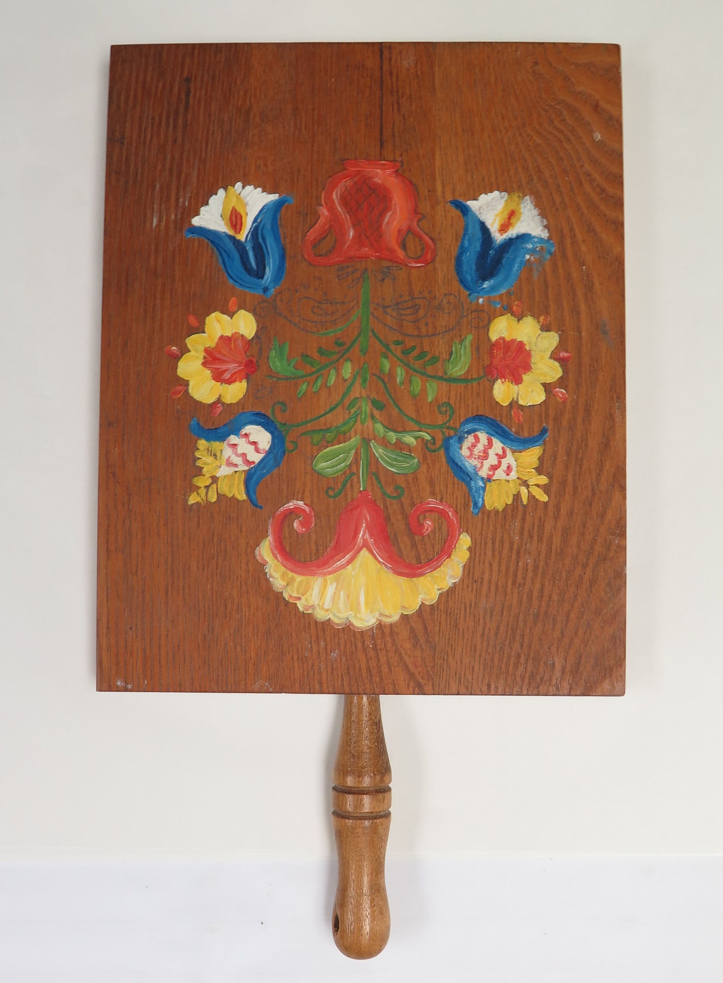This is a wood cutting board with a floral design hand painted on the front of it. The cutting board has a wood handle. The cutting board measures 0.5" (h) x 7" (w) x 12" (l).
