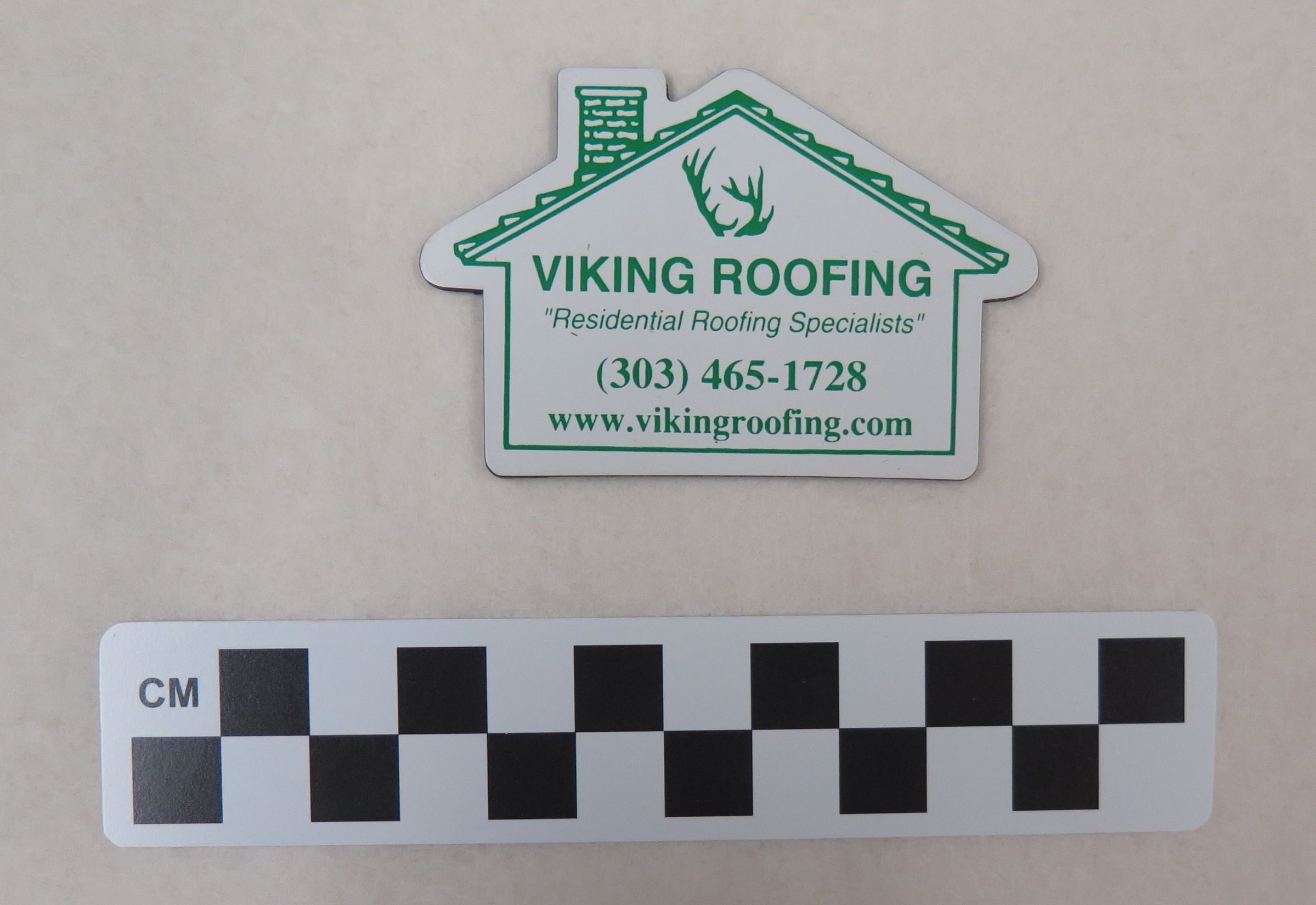 This is a white, house-shaped refrigerator magnet. The magnet has green text on the front that reads, "Viking Roofing/ 'Residential Roofing Specialists/ (303) 465-1728/ www.vikingroofing.com". The magnet measures 1.75" (h) x 2.75" (w).