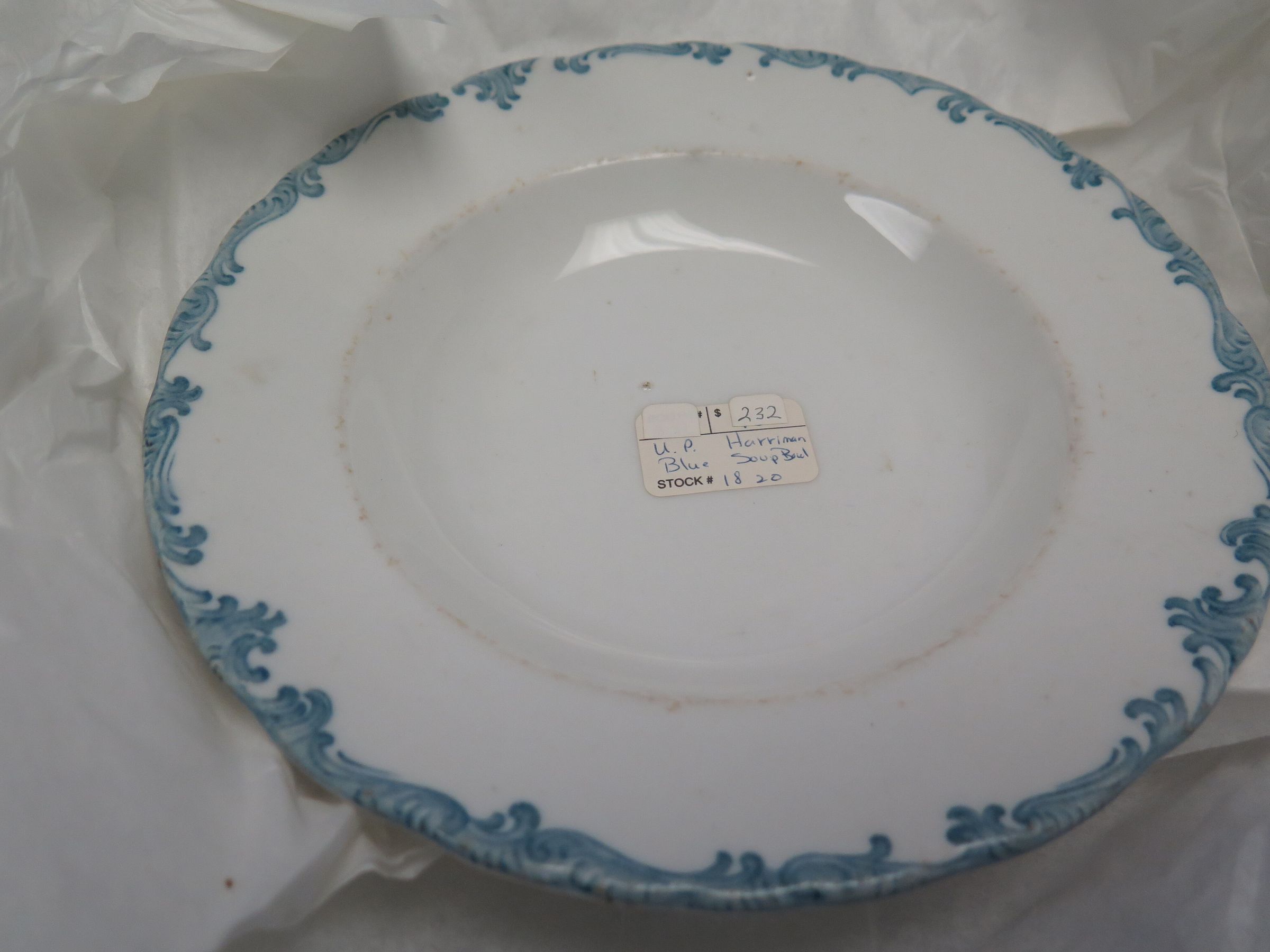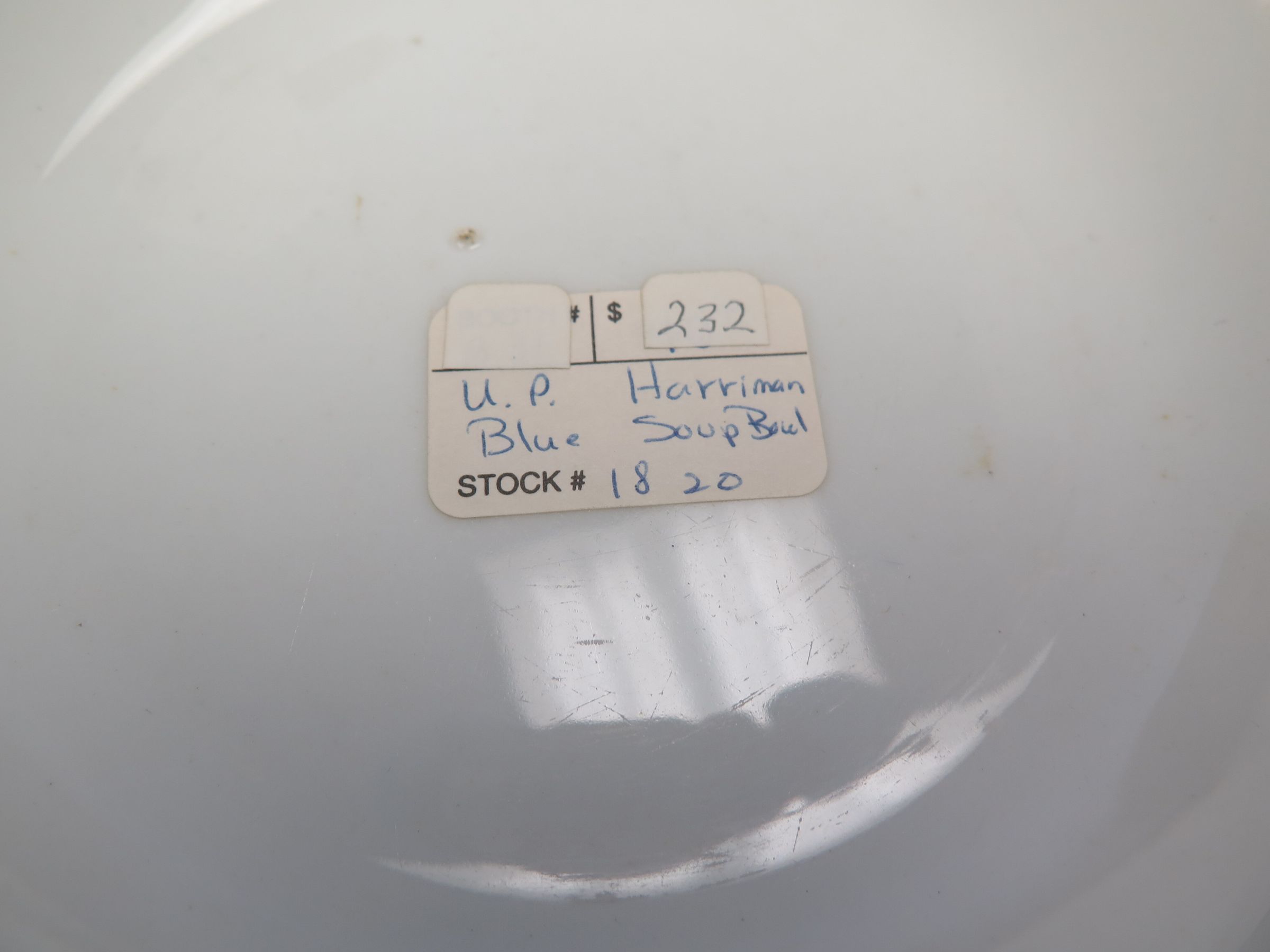 This is a white ceramic bowl with a blue filigree edge. There is a sticker in the middle of the bowl with text that reads, "232/ UP Harriman/ Blue Soup Bowl/ Stock #: 1820". The bowl measures 1.75" (h) x 9" (dia).