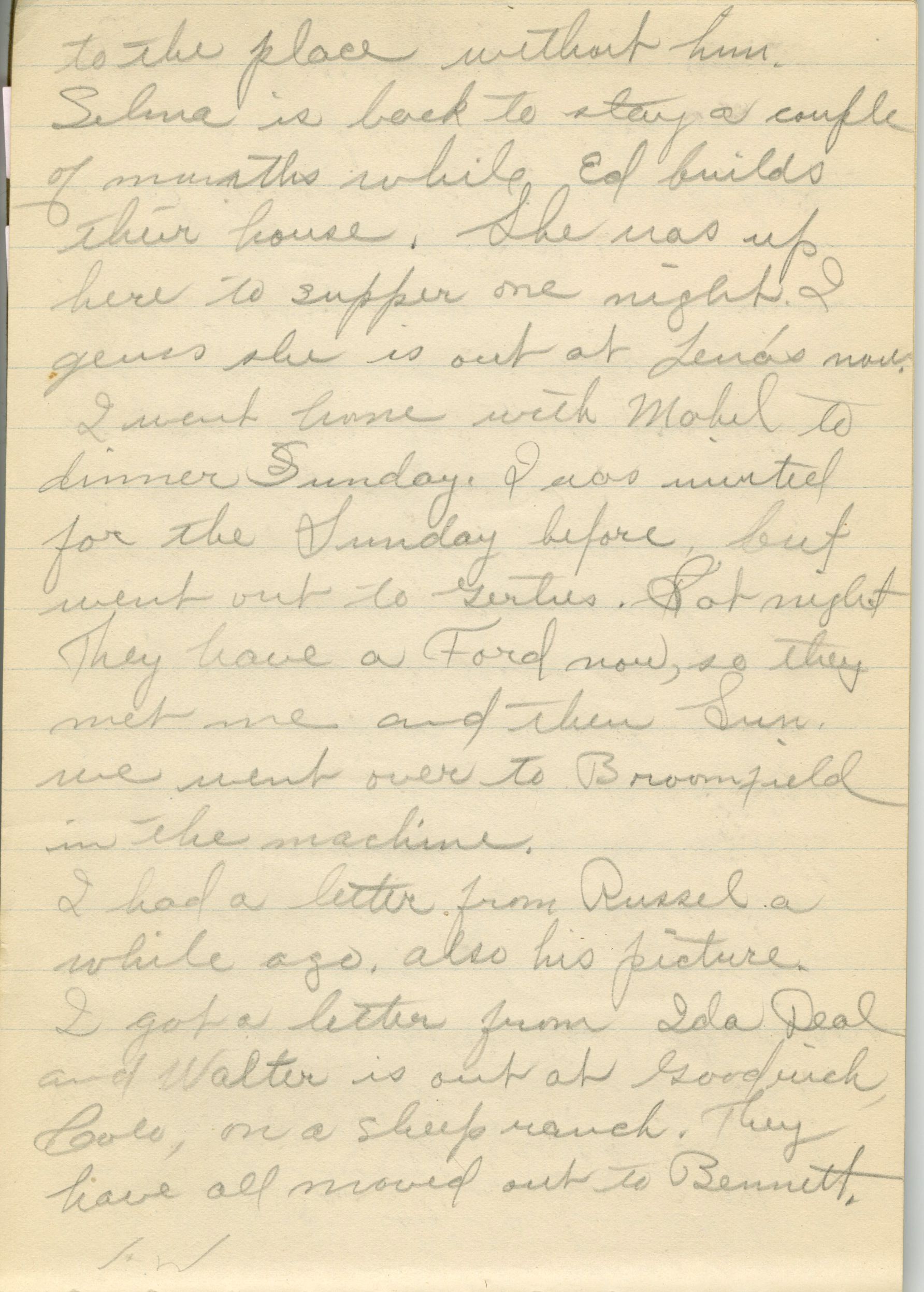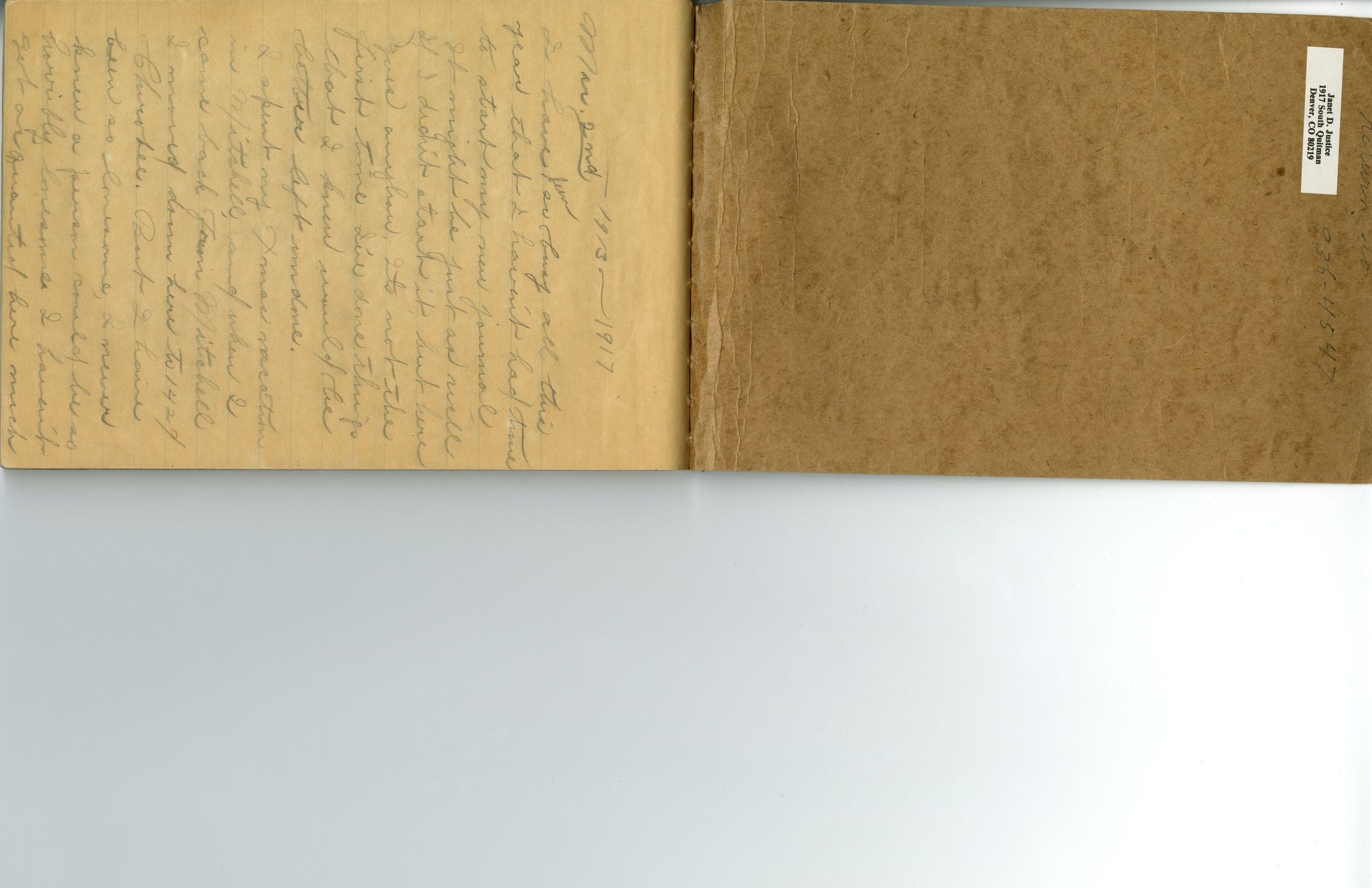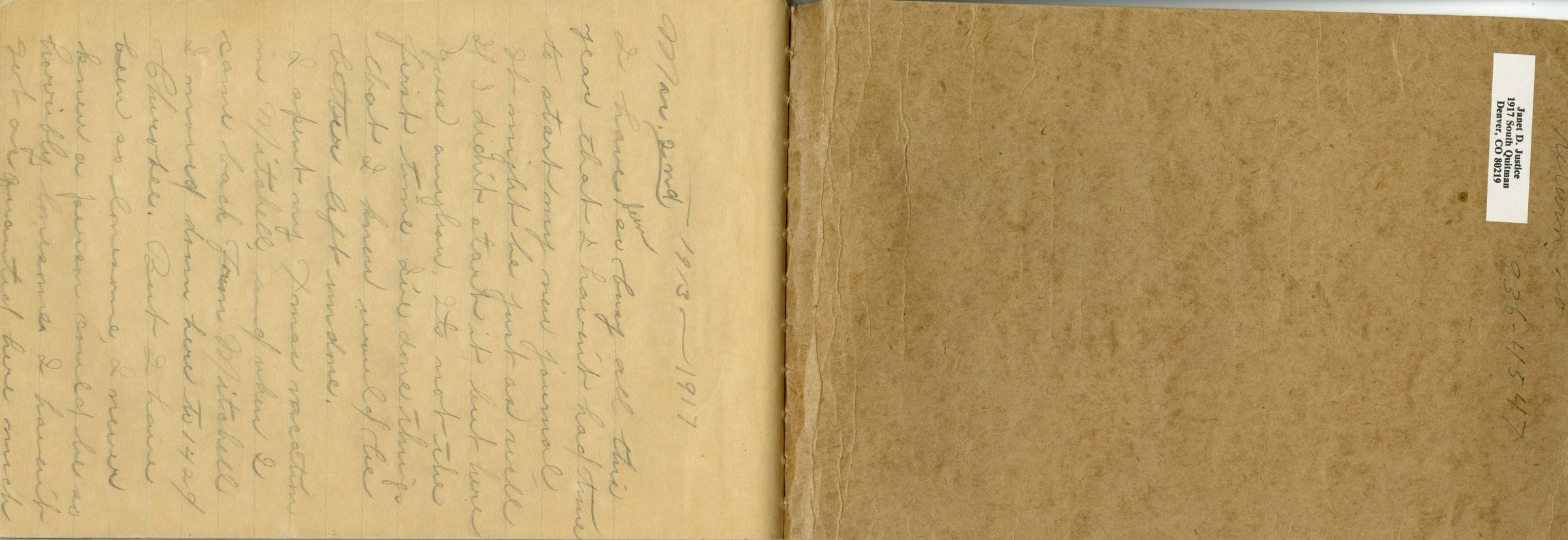 Custodial History: Frances Cron kept and wrote in two diaries from 1910 until 1917, when she married her husband, Russell Ridsdale. Both diaries, as well as a collection of Frances' photographs and poems, were eventually passed on to one of Frances' daughters, Janet Ridsdale Justice-Waddington. Janet donated the poems and digital scans of the journals and photographs to the Broomfield Depot Museum in 2015.