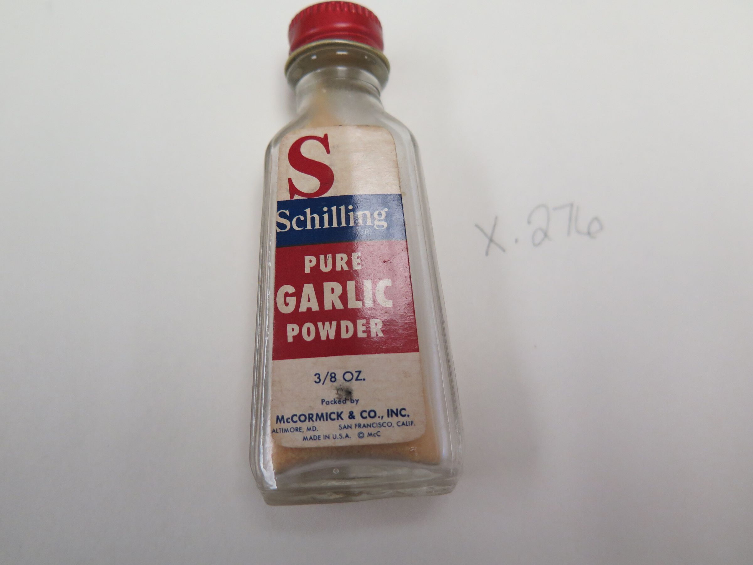 This is a clear glass bottle of Schilling brand Pure Garlic Powder with a red metal lid. The bottle measures 3" (h) x 1.25" (w) x 0.5" (d).