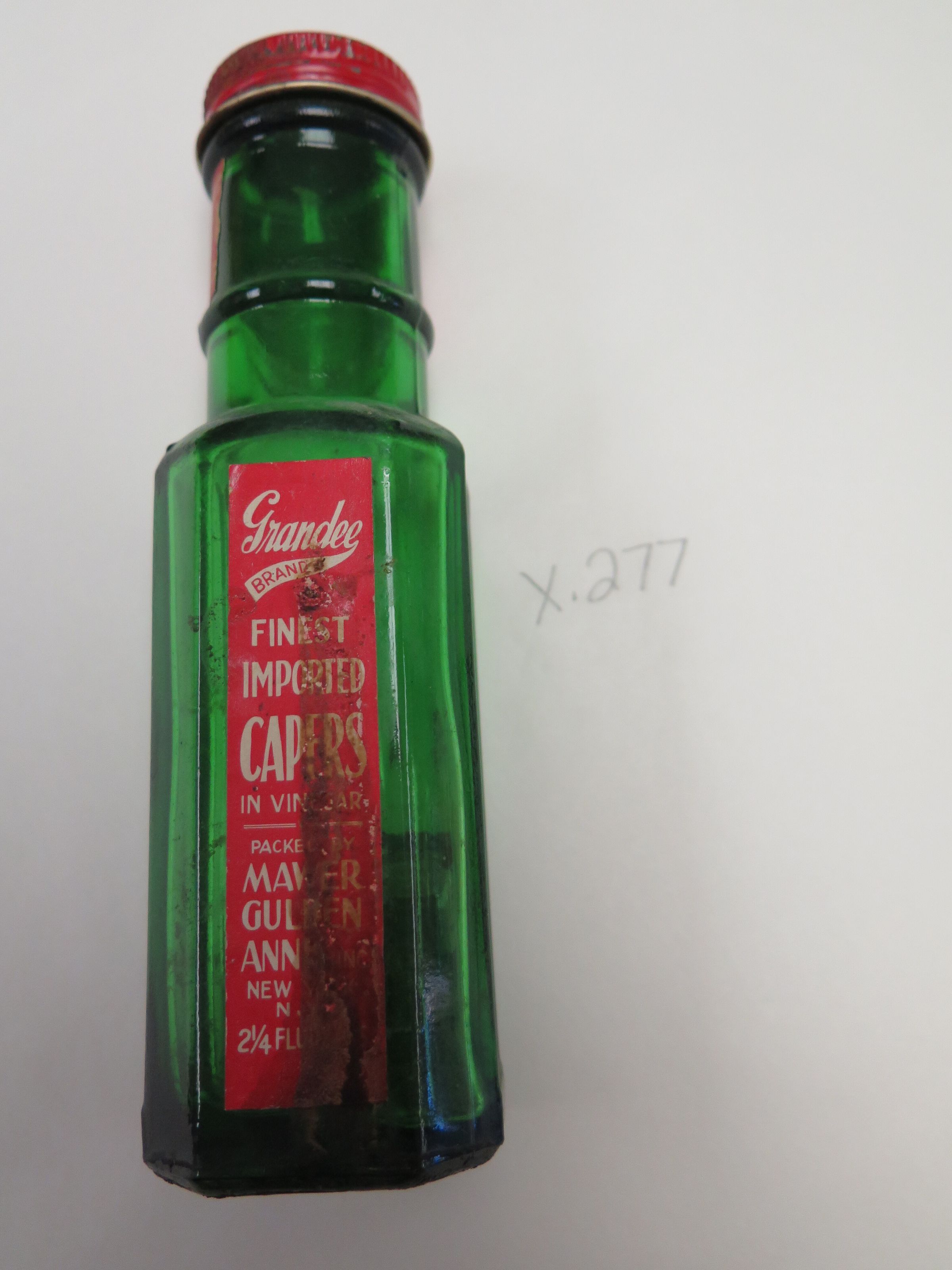 This is a green glass jar of Grandee's brand Capers with a red metal lid and a red label on the front. The jar measures 6" (h) x 1" (w) x 1" (d).