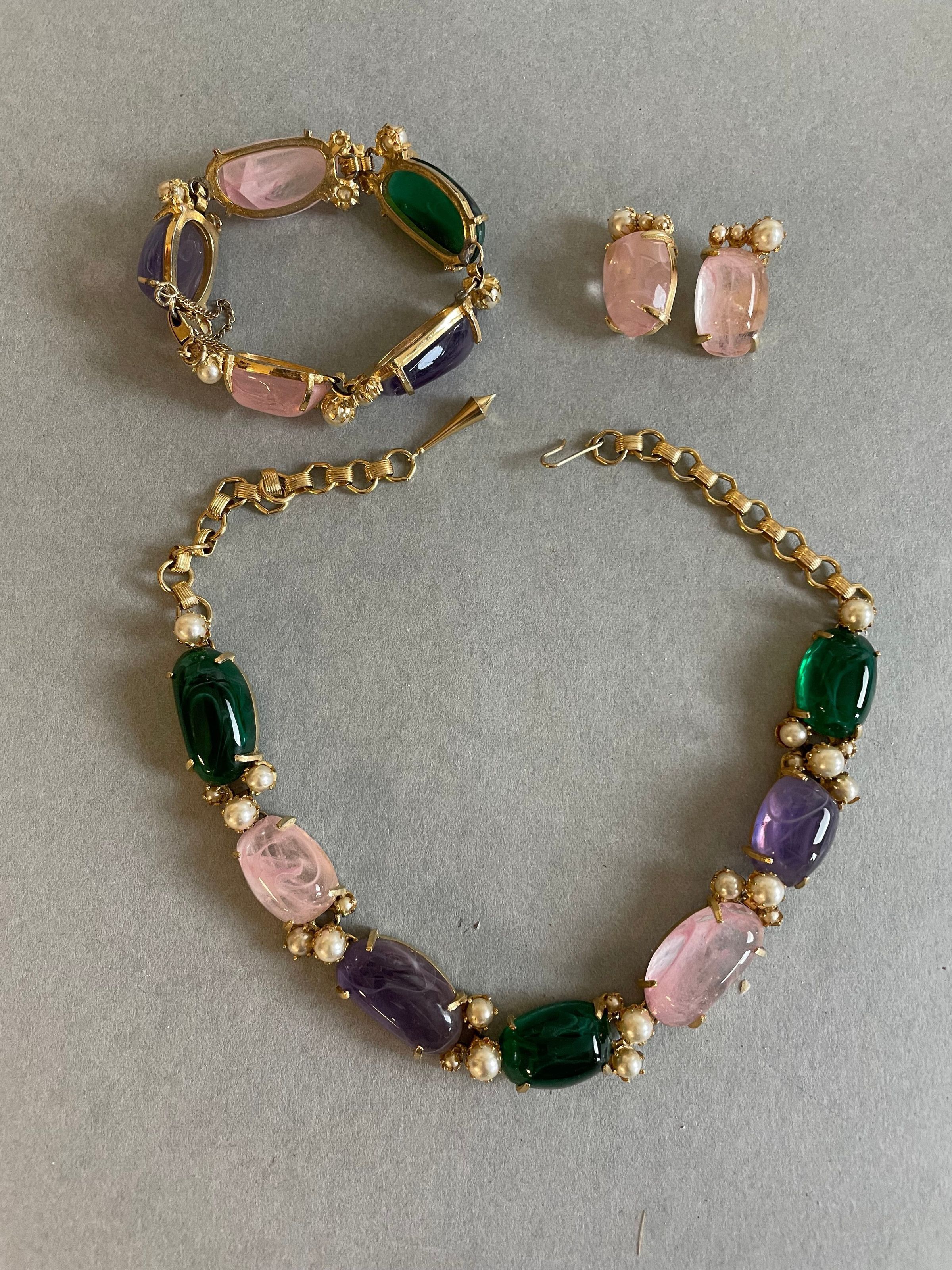 A collection of replica jewelry containing the only copy of a necklace (a), bracelet (b), and earrings (c) originally designed as a gift for Dwight D. Eisenhower's wife, Mamie Down Eisenhower right after the end of WWII.