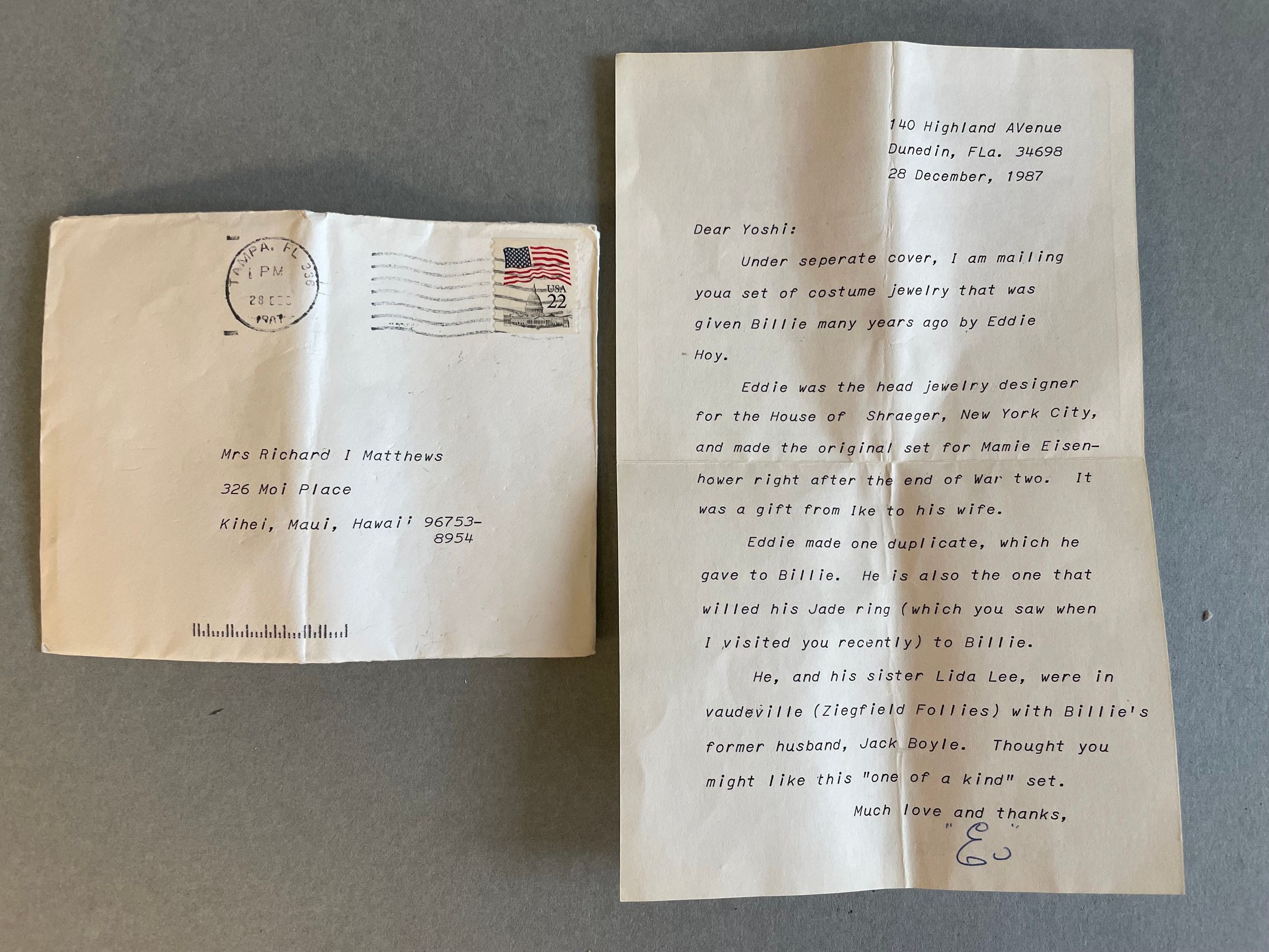 The replica jewelry came with an additional pink pouch (d), letter addressed to Yoshi (e), and envelope containing it (f). Letter dated December 28, 1987.Collection