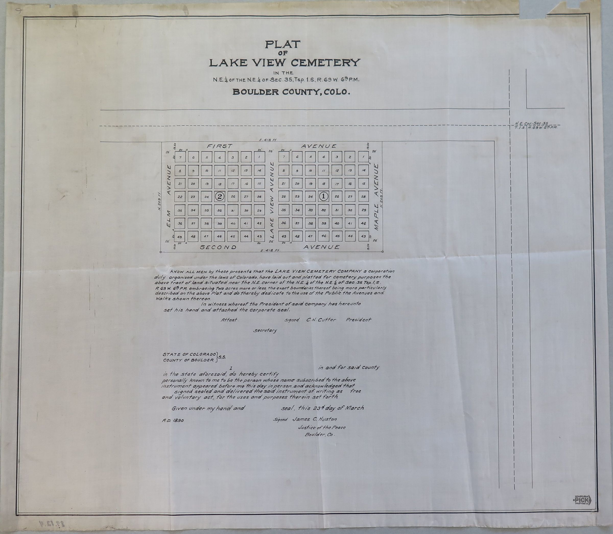 Linen plat map of Lake View Cemetery, dated 1890 when the cemetery first opened under the auspices of the Lakeview Cemetery Association. The map shows the layout of numbered plots available in the cemetery upon opening, as well as the block and boundary of land first purchased by Adolf Zhang before selling to the Association. The map has printed text from the Association President C.N. Cutter and Justice of the Peace for Boulder James C. Huston marking the opening of the cemetery. The map also lists the cemetery as part of Boulder County, CO. The map's publisher was Pick Drafting Co., Denver, CO.