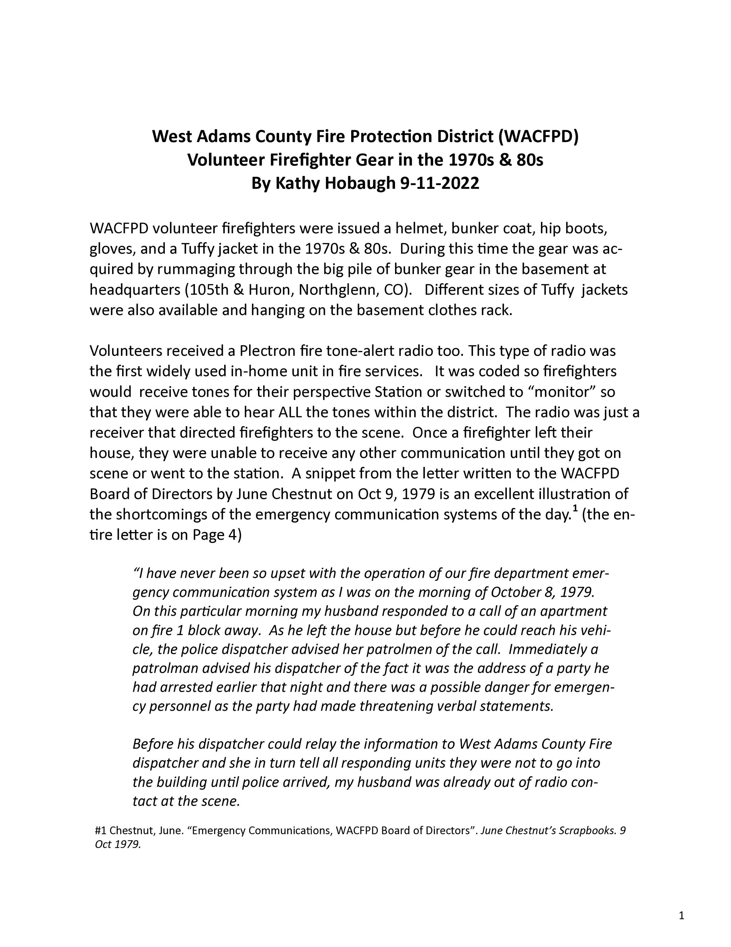 a.) Informational pages written by Kathy Hobaugh detailing the gear worn and used by volunteer firefighters in the 1970s and 1980s. Includes an excerpt of an article written about volunteer firefighter Tom Chestnut (full article can be found in the Broomfield Enterprise, Volume 5, Number 2, October 11, 1979), images of the 1983 gear worn by WACFPD volunteer firefighters, a letter written to the WACFD Board of Directors by June Chestnut in 1979, and images of radios used by the WACFPD firefighters.