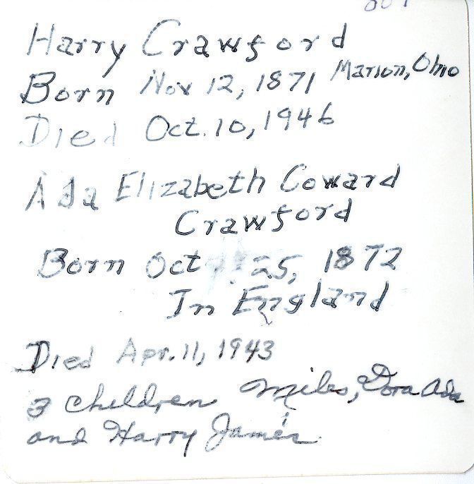 Harry Crawford (November 12, 1871 - October 10, 1946), born in Marion Ohio. Ada Elizabeth Crawford (October 25, 1872 - April 11, 1943), born in England. They had three children Miles, Dora Ada and Harry James. Photograph of portraits of Harry and Ada Crawford.Photograph Details
