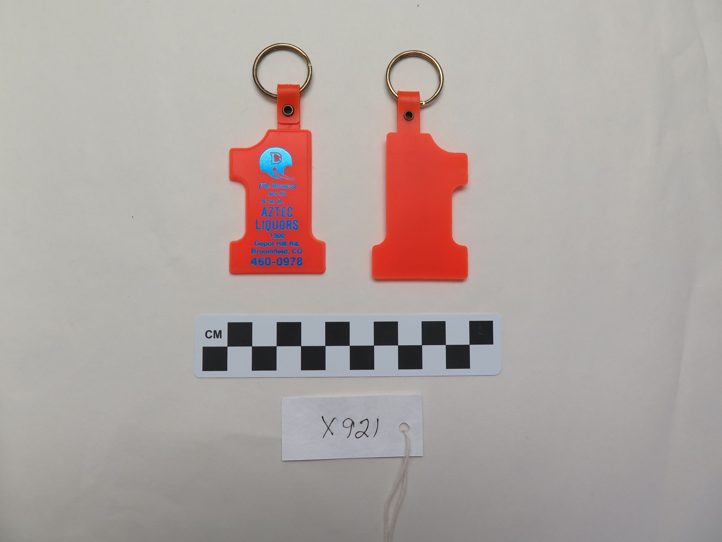 This is an orange key chain that is shaped like the number one. The key chain was distributed by Aztec Liquors as promotional material. The key chain measures 1.5" (h) x 4" (l).