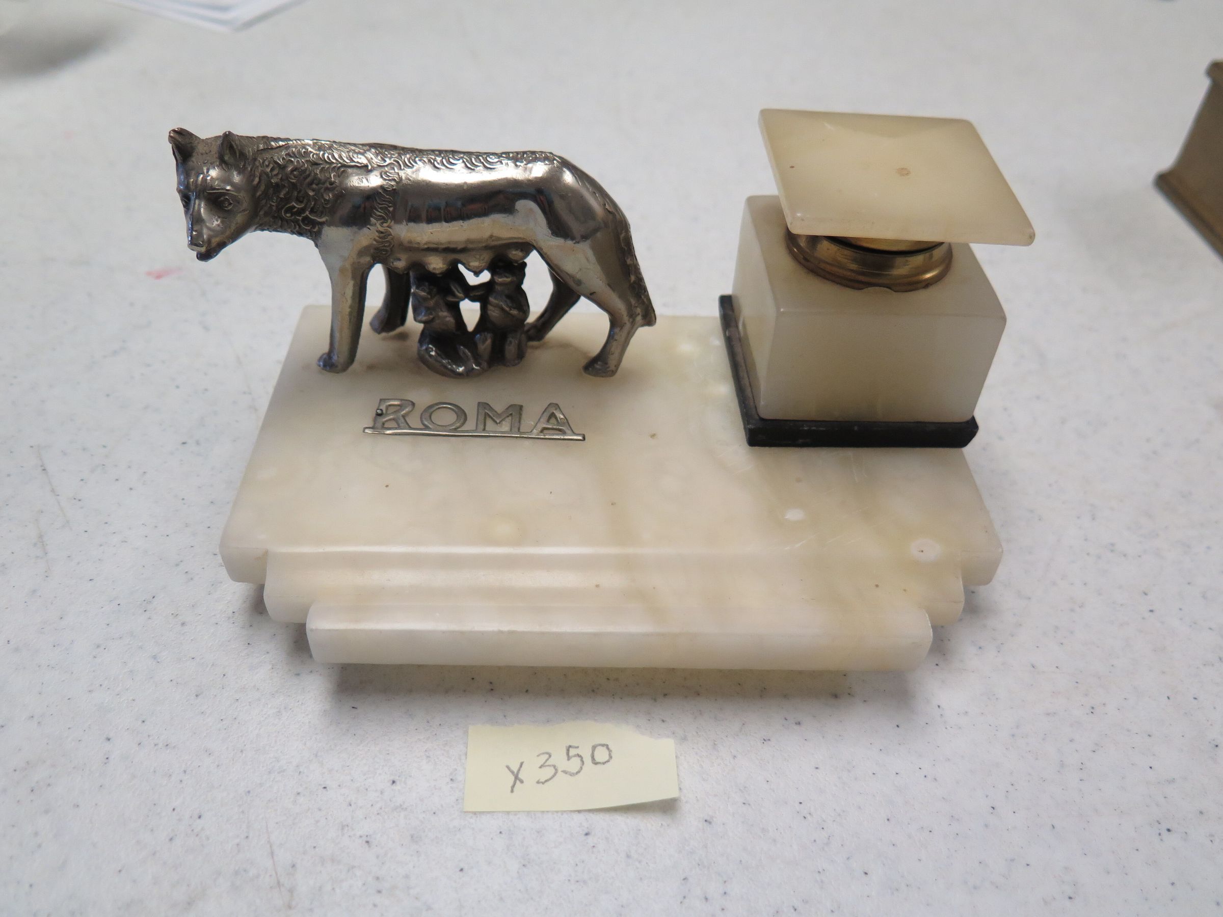 This is white marble? inkwell on a matching base with a figurine of a wolf and 2 pups on it. The inkwell measures 3.5" (h) x 6.5" (w) x 4.25" (d).