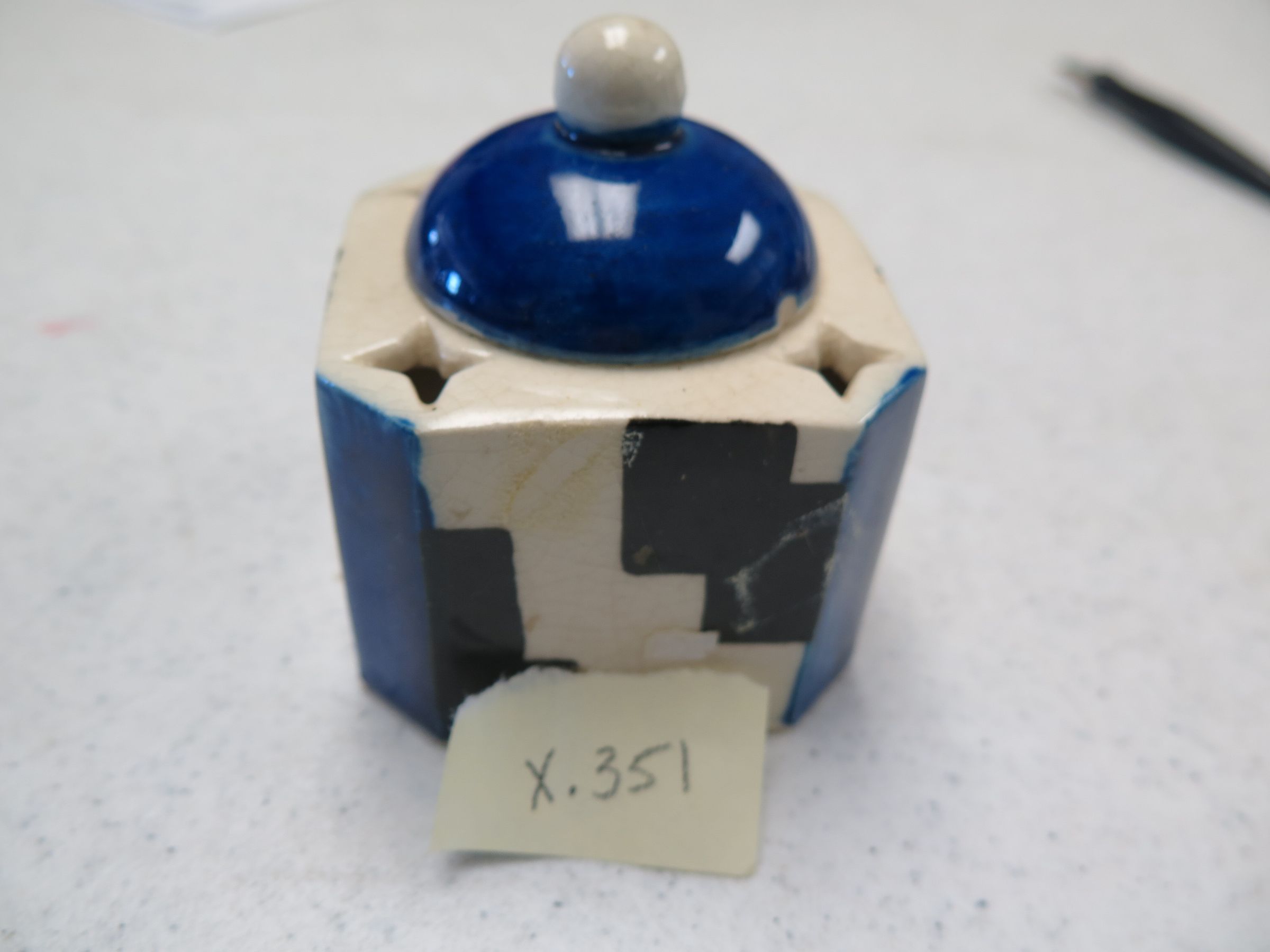 This is a ceramic inkwell with a lid. The base of the inkwell is a square with the corners cut off. The flat edges where the corners would be are all painted blue. The side of the square are black and white. The lid of the inkwell is painted blue with a white ball at the top. The inkwell measures 3" (h) x 2.75" (w) x 2.75" (l).