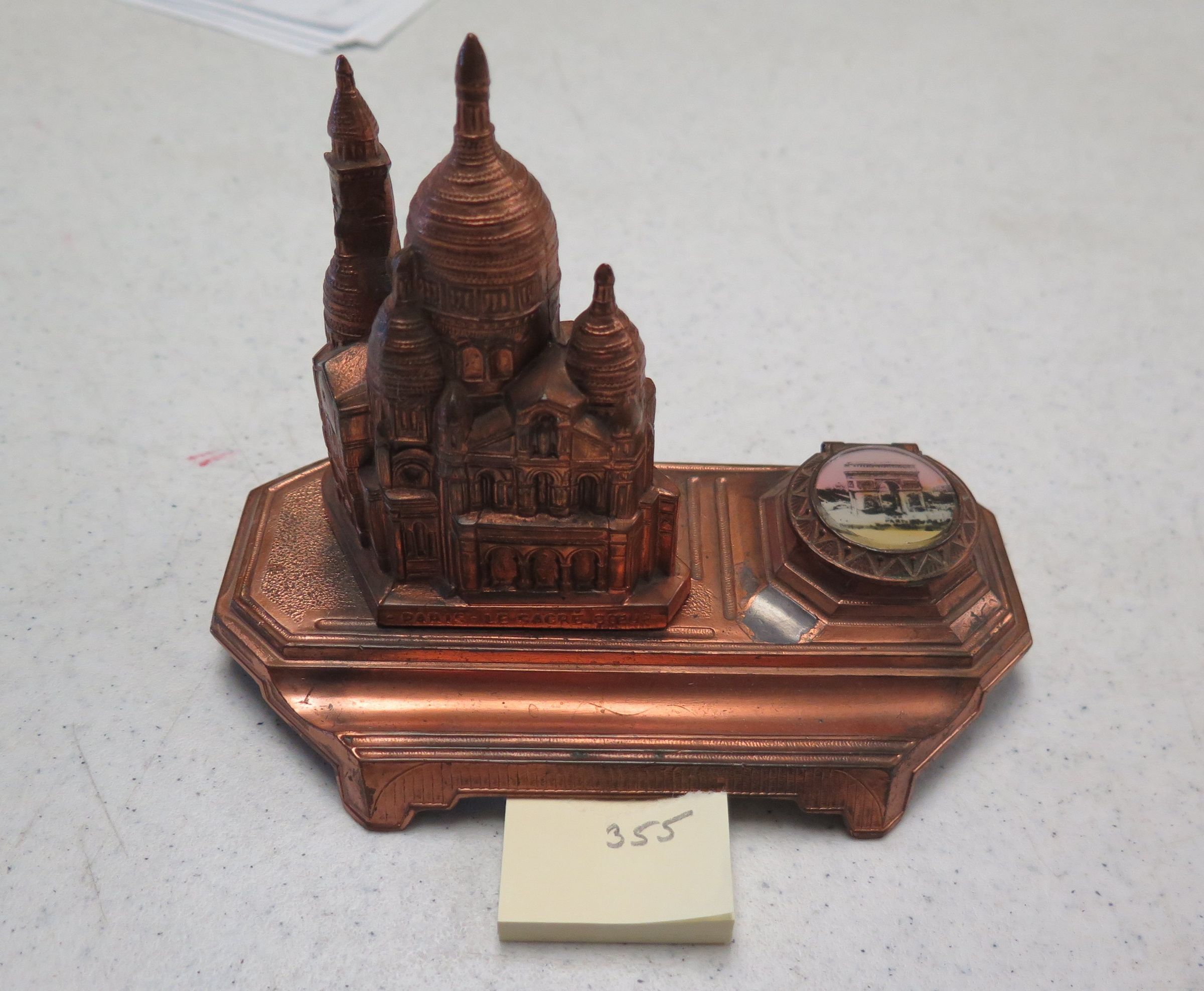 This is a copper colored souvenir inkwell. The base of the inkwell is shaped like the Basilica of the Sacred Heart (Le Sacre Coeur) in Paris. "Paris le Sacre Coeur" is inscribed along the bottom of the front of the basilica. The inkwell measures 4.5" (h) x 6.5" (w) x 3.5" (d).