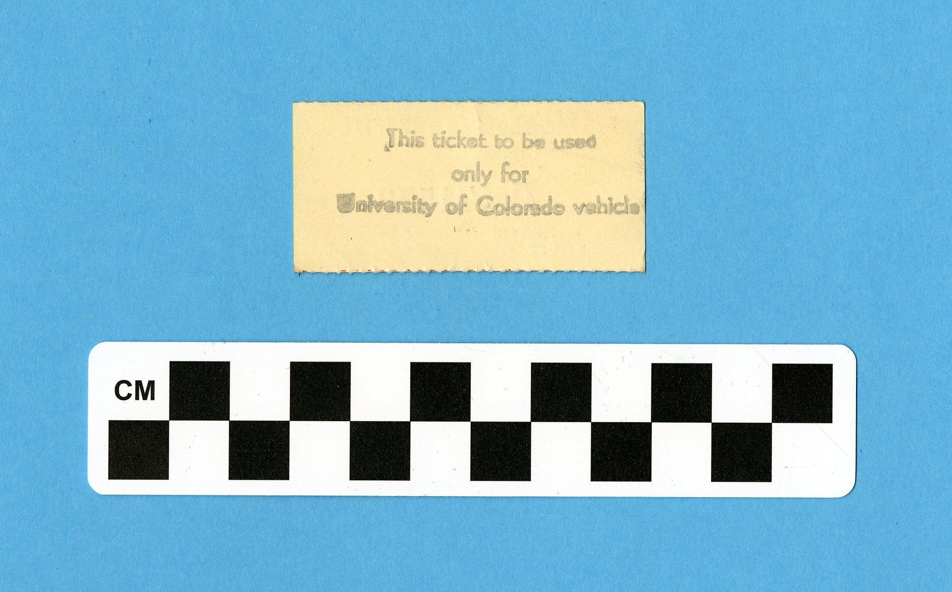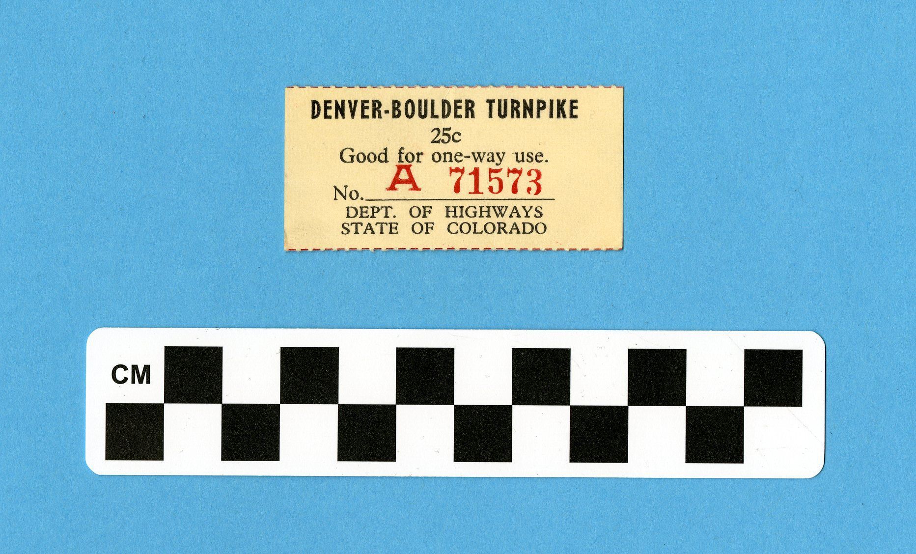 A ticket for one way passage at the Denver-Boulder Turnpike, through US Highway 36. The ticket was used in 1966. The cost for the passage granted by the ticket was 25 cents. The ticket is numbered by red stamp, "A 71573." On back, inscription "This ticket to be used only for University of Colorado vehicle" is stamped in black ink. Ticket was printed for use by the Department of Highways, State of Colorado.Collection