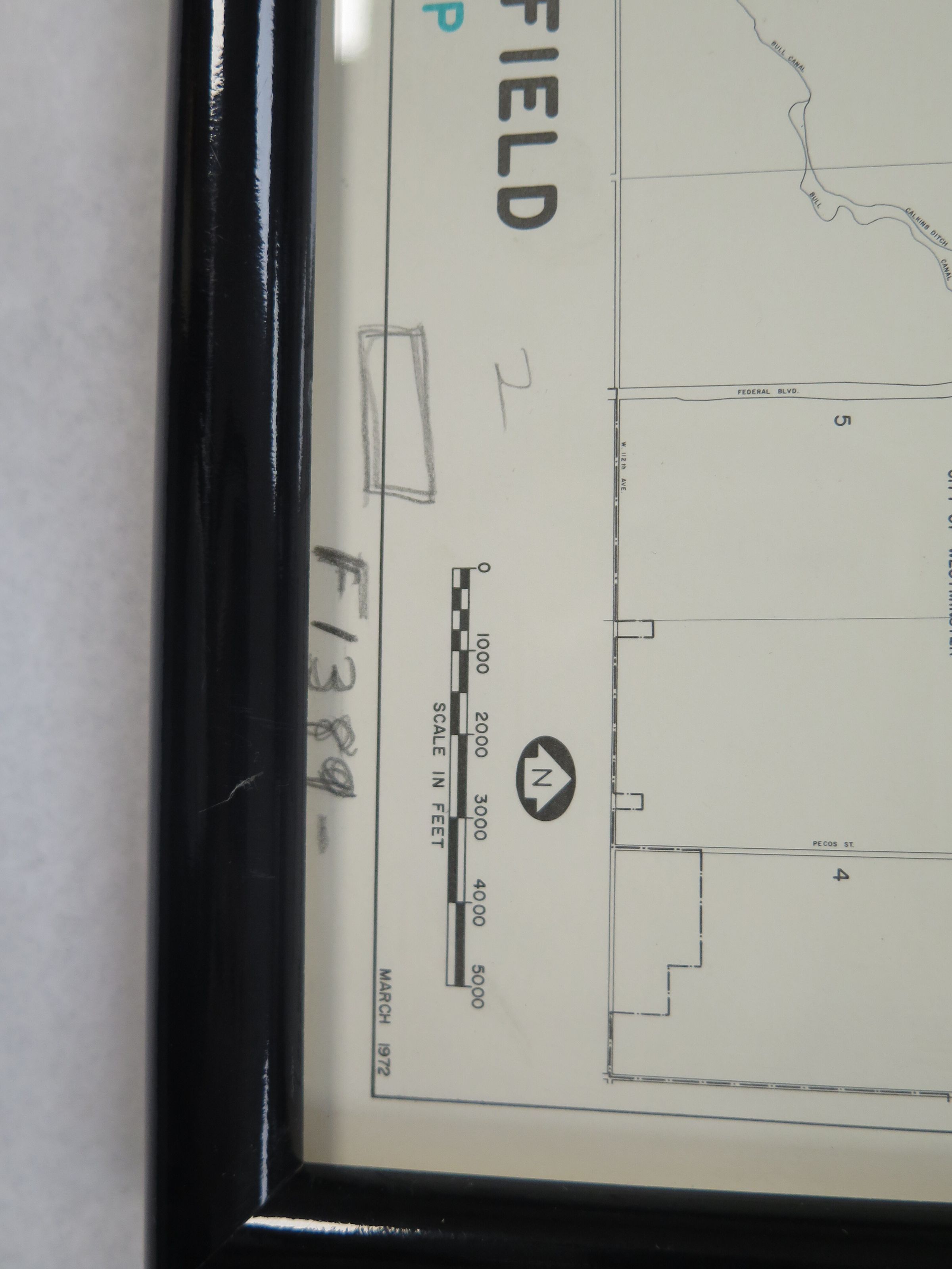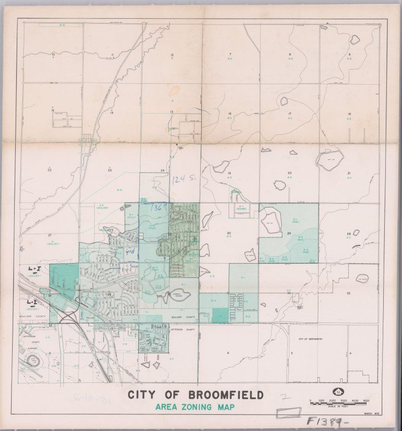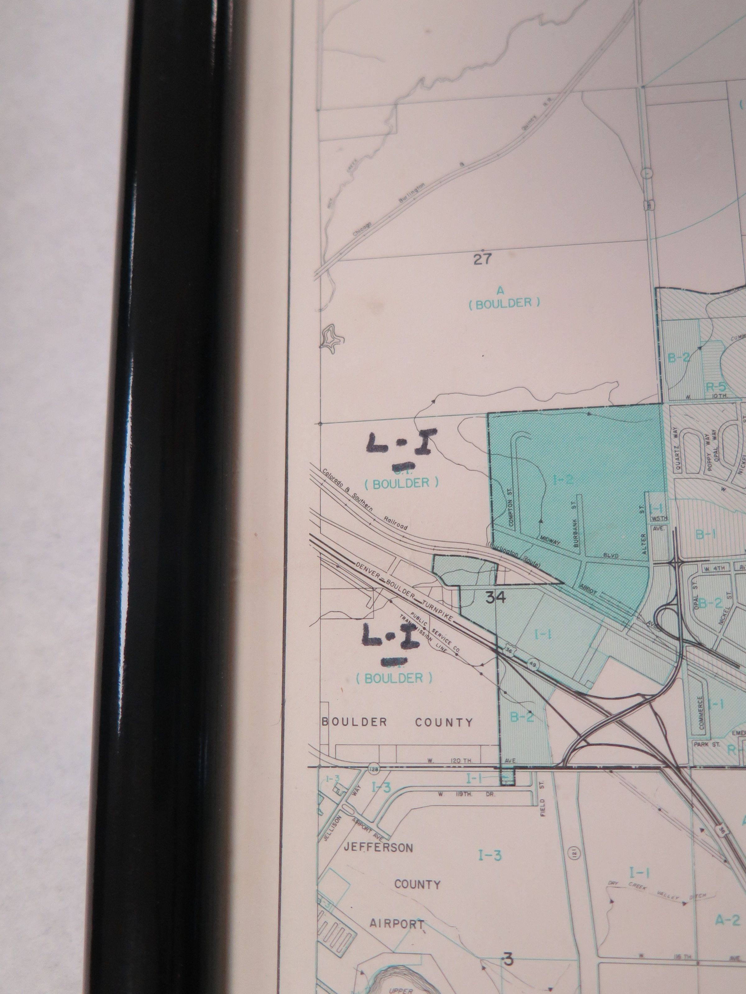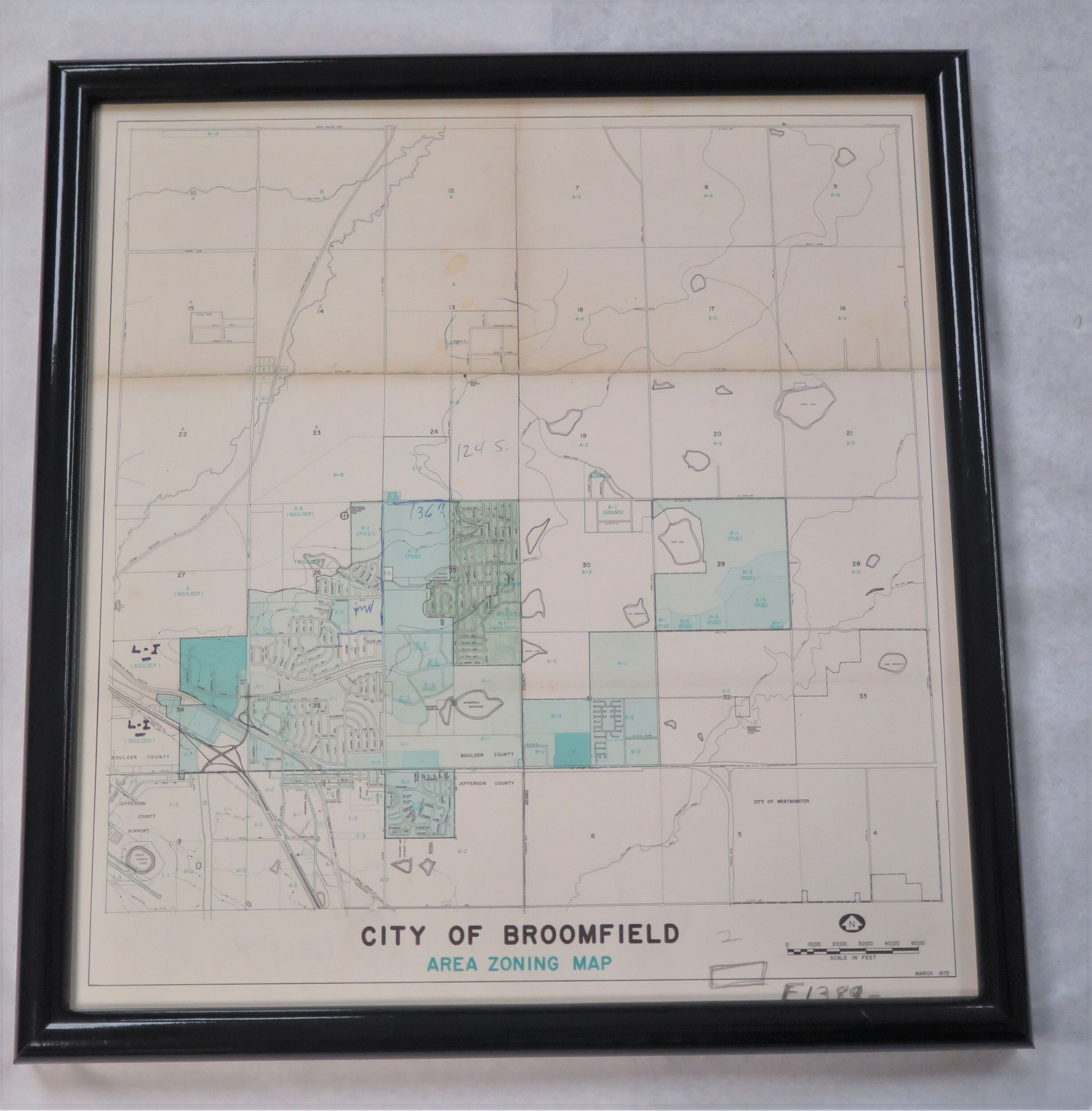 This is a framed Area Zoning Map of the City of Broomfield. The black frame measures 13.5" (h) x 12.75" (w) x 1" (d).