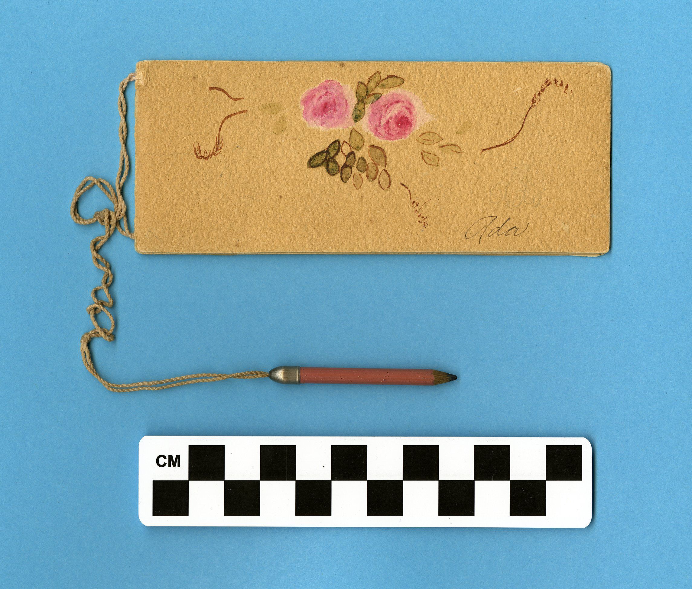 2" x 5 1/4" notepad, with approx. 6" string, 2" wood pencil. Notepad has four pages total. Housed in one legal size folder.Archive Notes