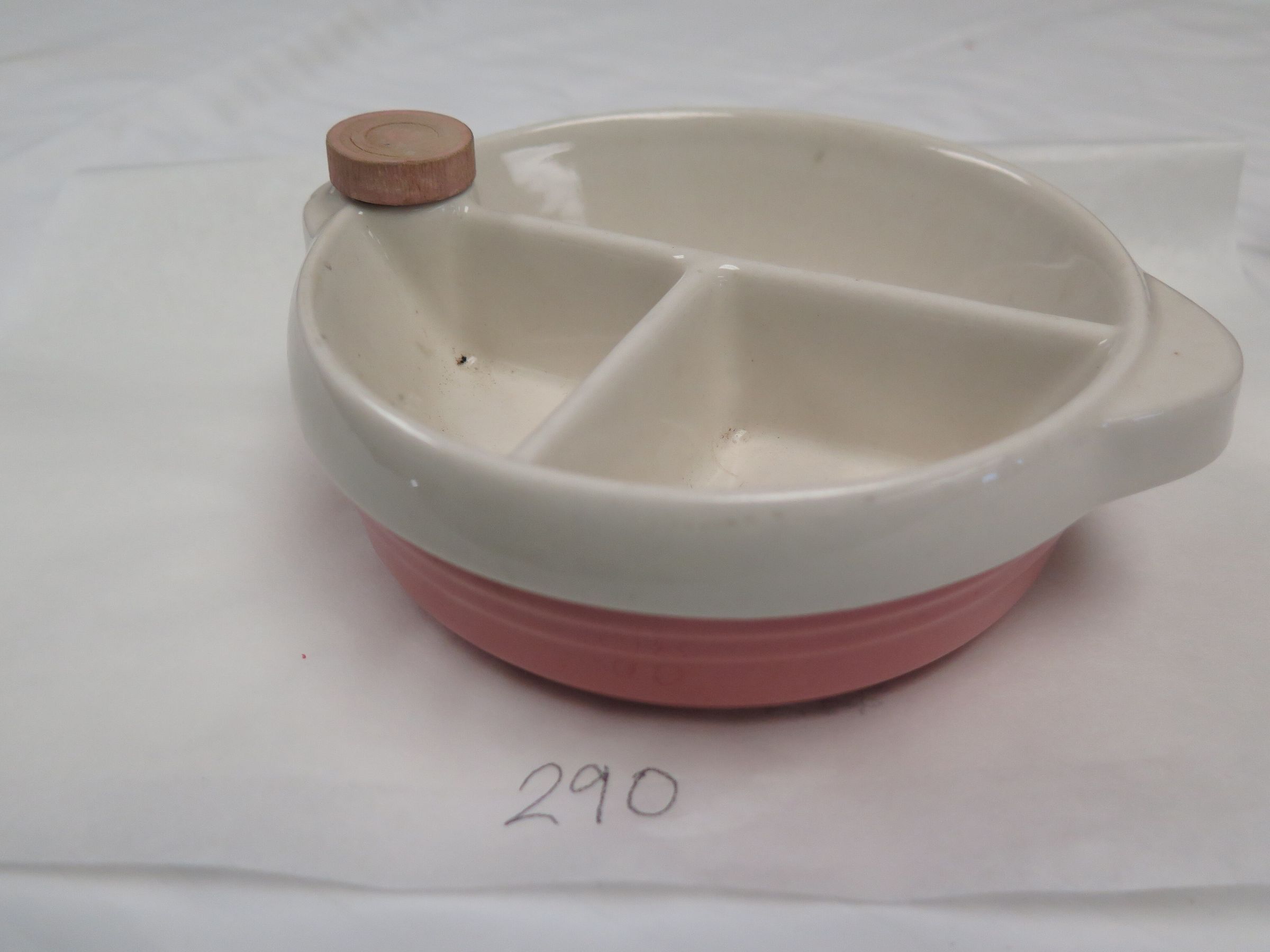 This is a children's eating dish with different compartments for the food. The dish is white on the top and pink around the base. The dish measures 2" (h) x 7" (w).