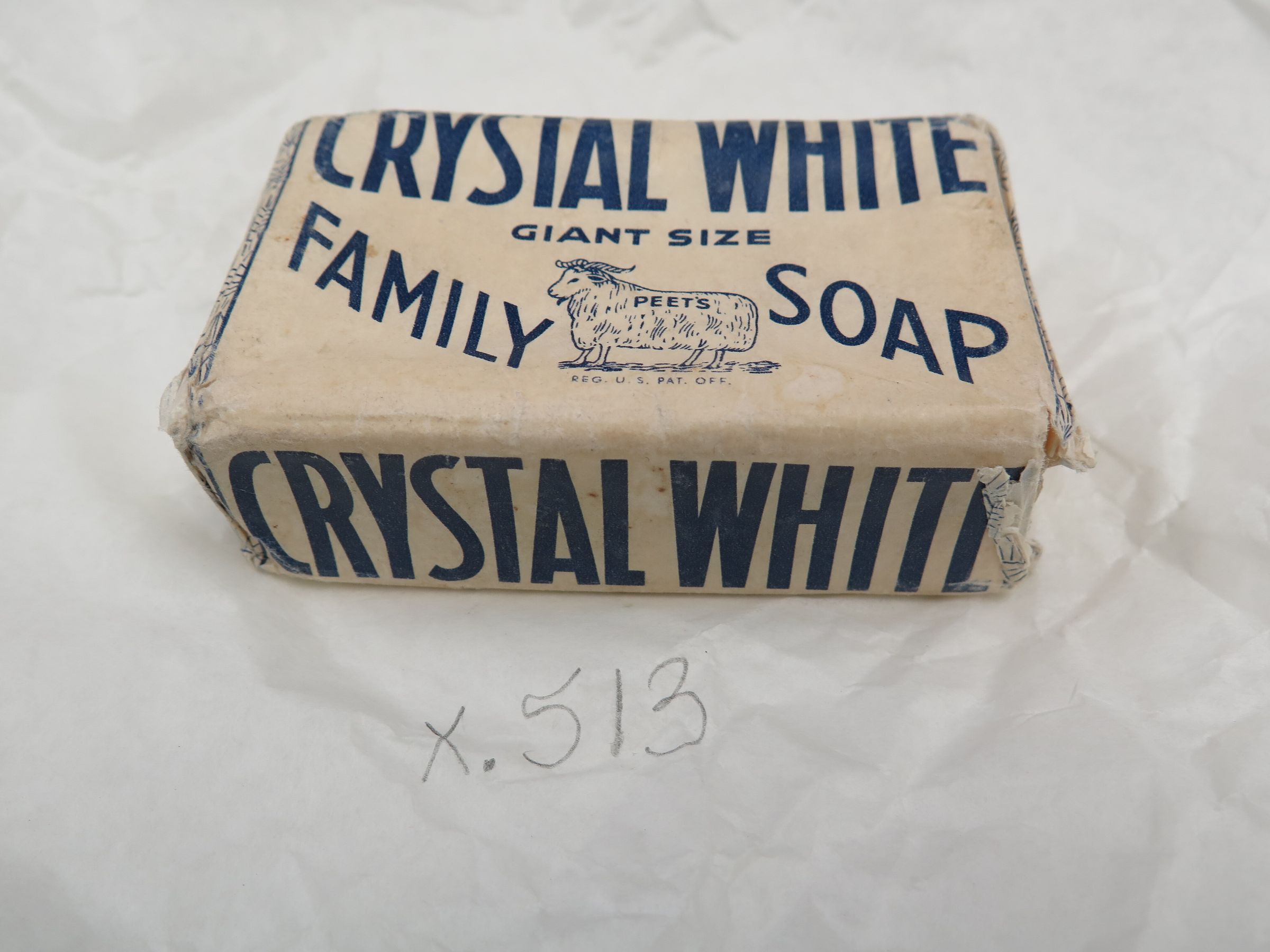 This is a bar of soap in the original packaging. The packaging has text on the front that reads, "Crystal White/ Giant Size/ Family Soap". The soap measures 1.25" (h) x 4" (w) x 2.5" (d).