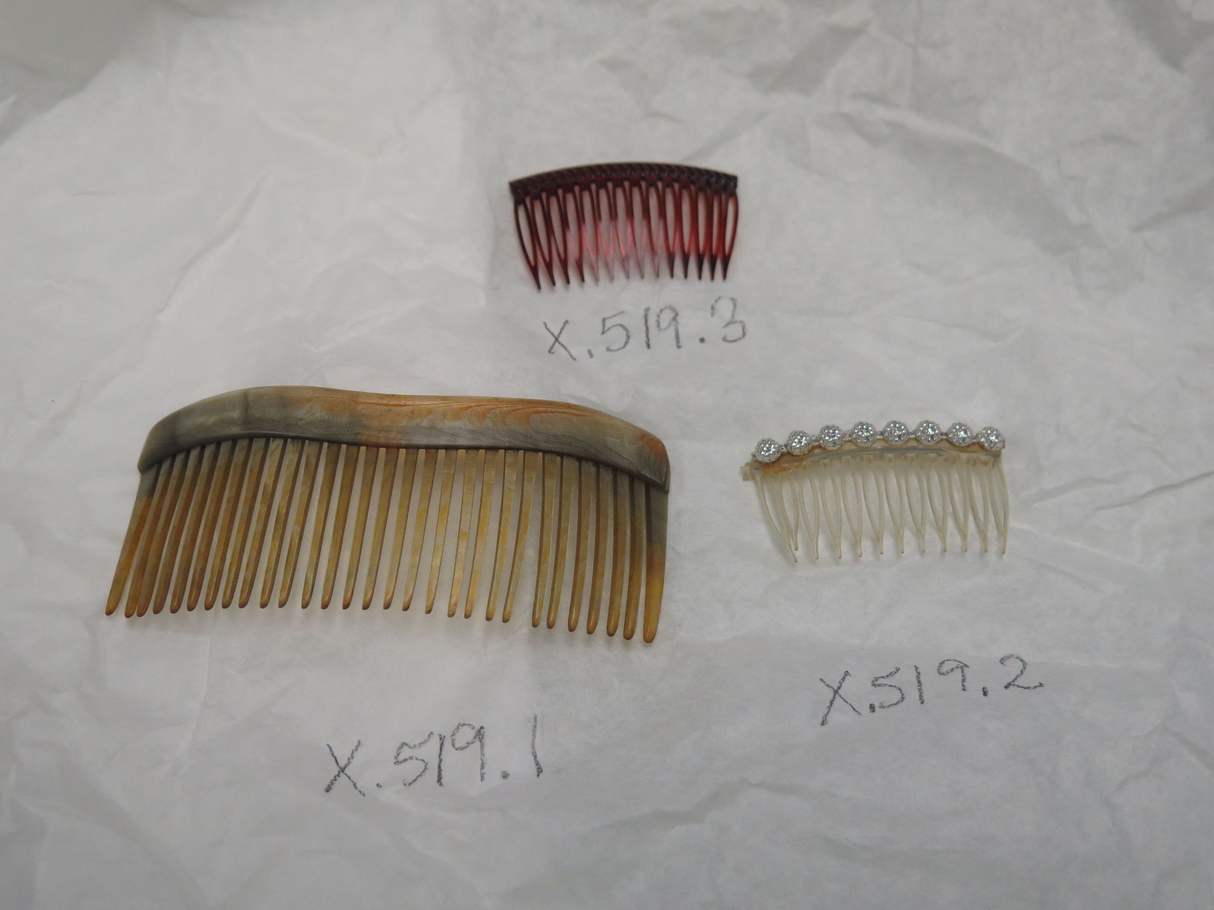 This is a set of 3 hair combs. The large comb is green plastic. The smaller combs are silver with beads and brown plastic. The combs measure 1.75" (w) x 4.5" (l) and 1" (w) x 2" (l).