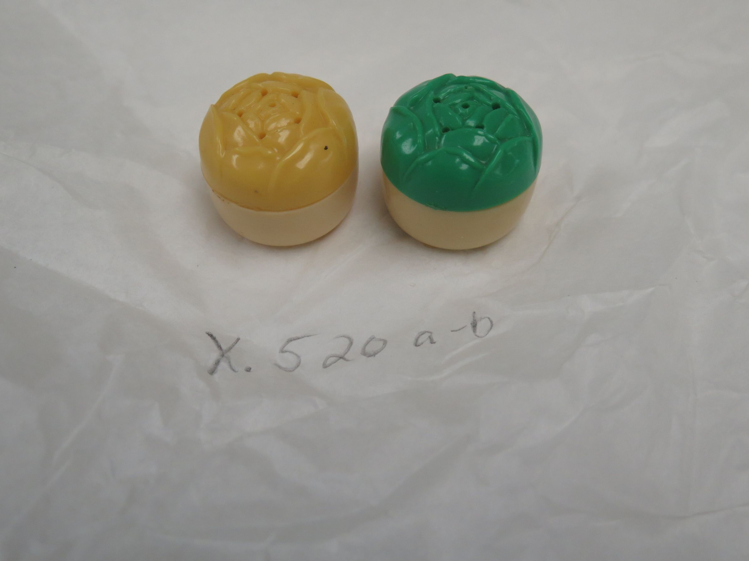 This is a set of plastic salt and pepper shakers. The set has tan bases with one green and one yellow top. The shakers each measure 1" (h) x 1" (dia).