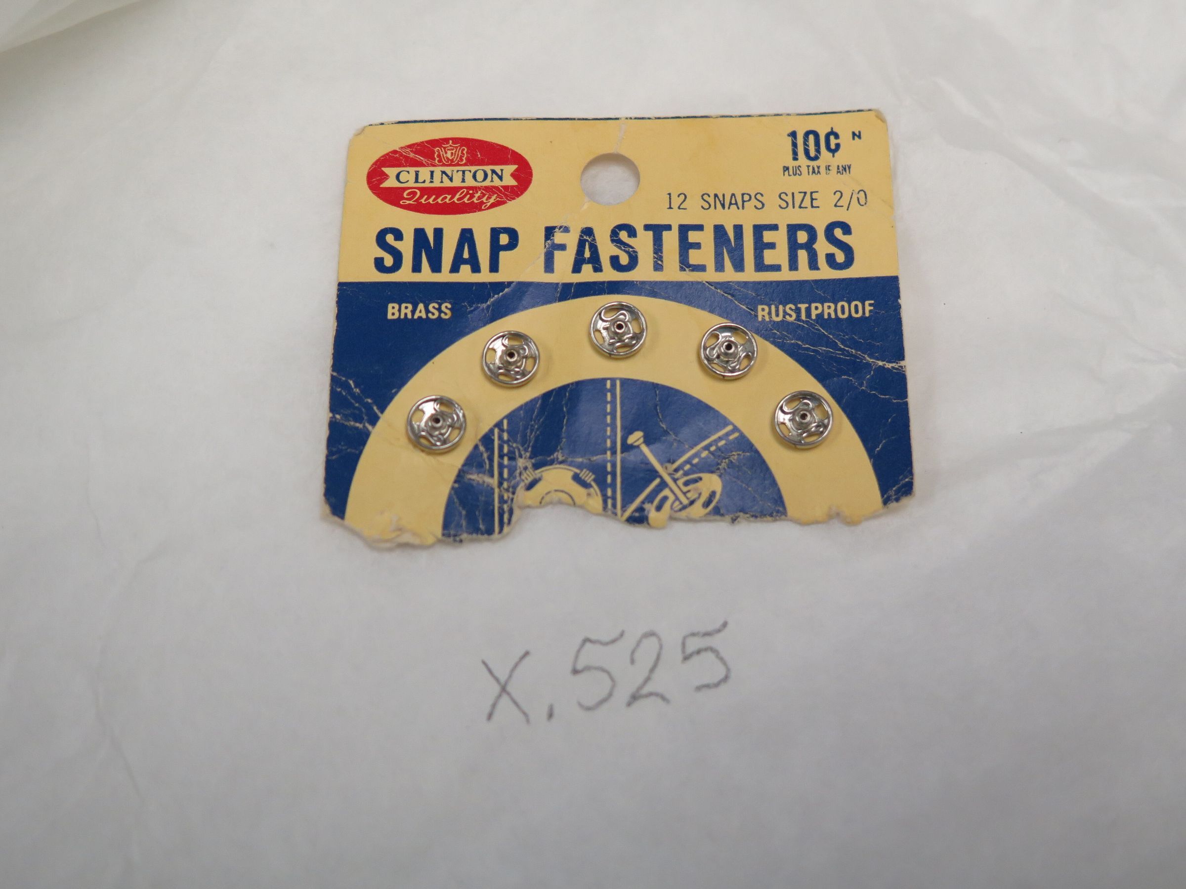 This is a set of 5 snap fasteners on a card. The card is blue and white, and the bottom half is missing. The card measures 2.5" (w) x 2.75" (l).