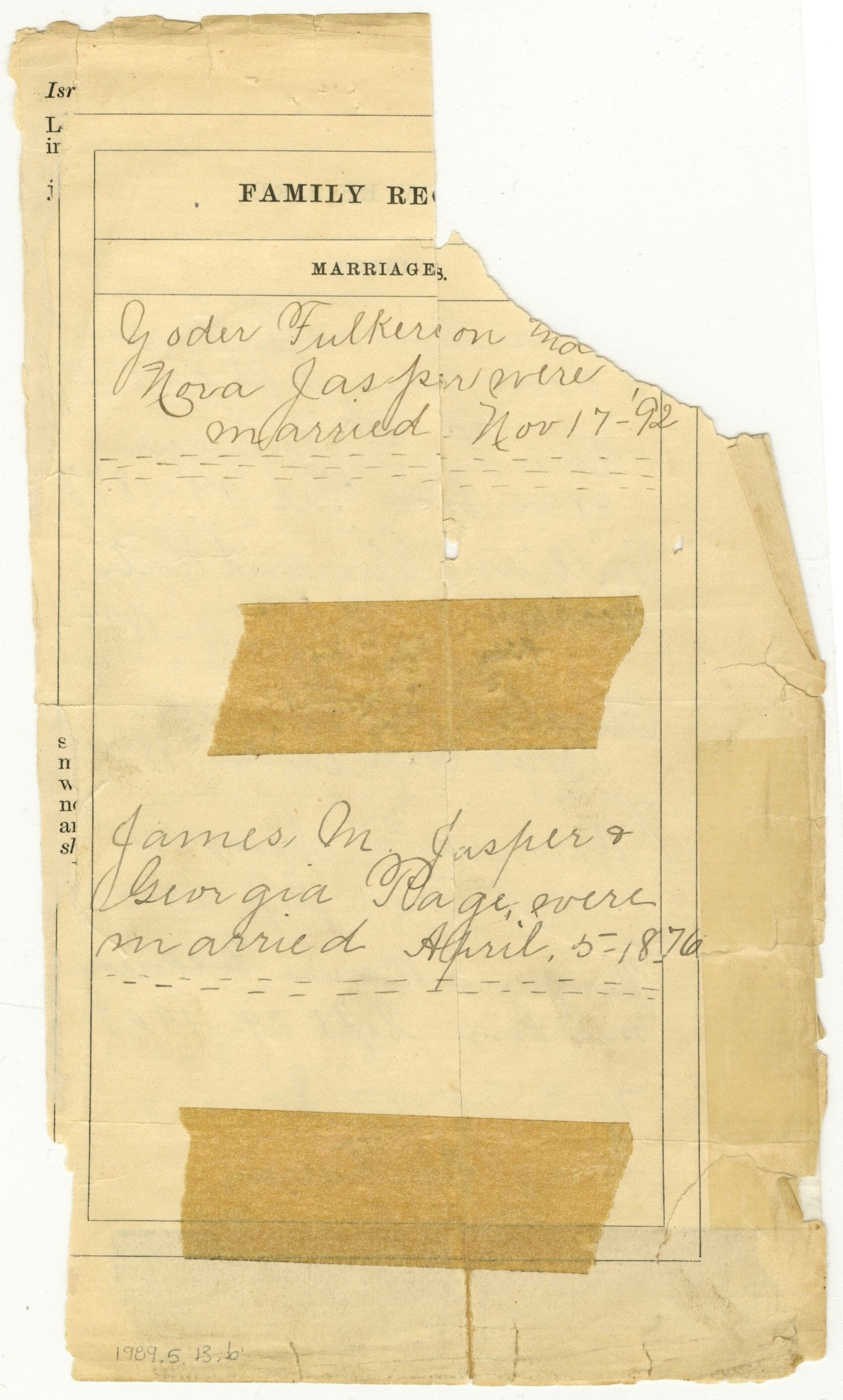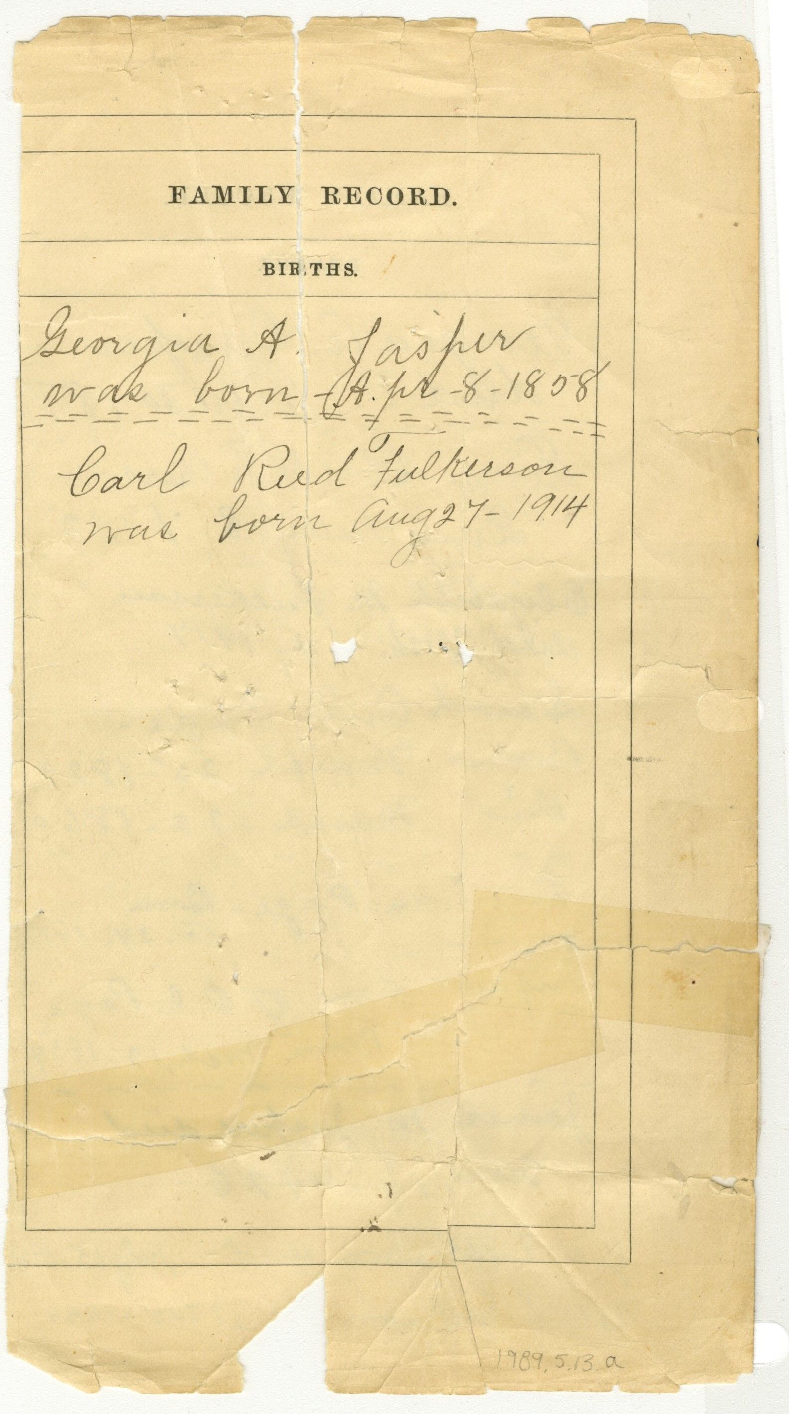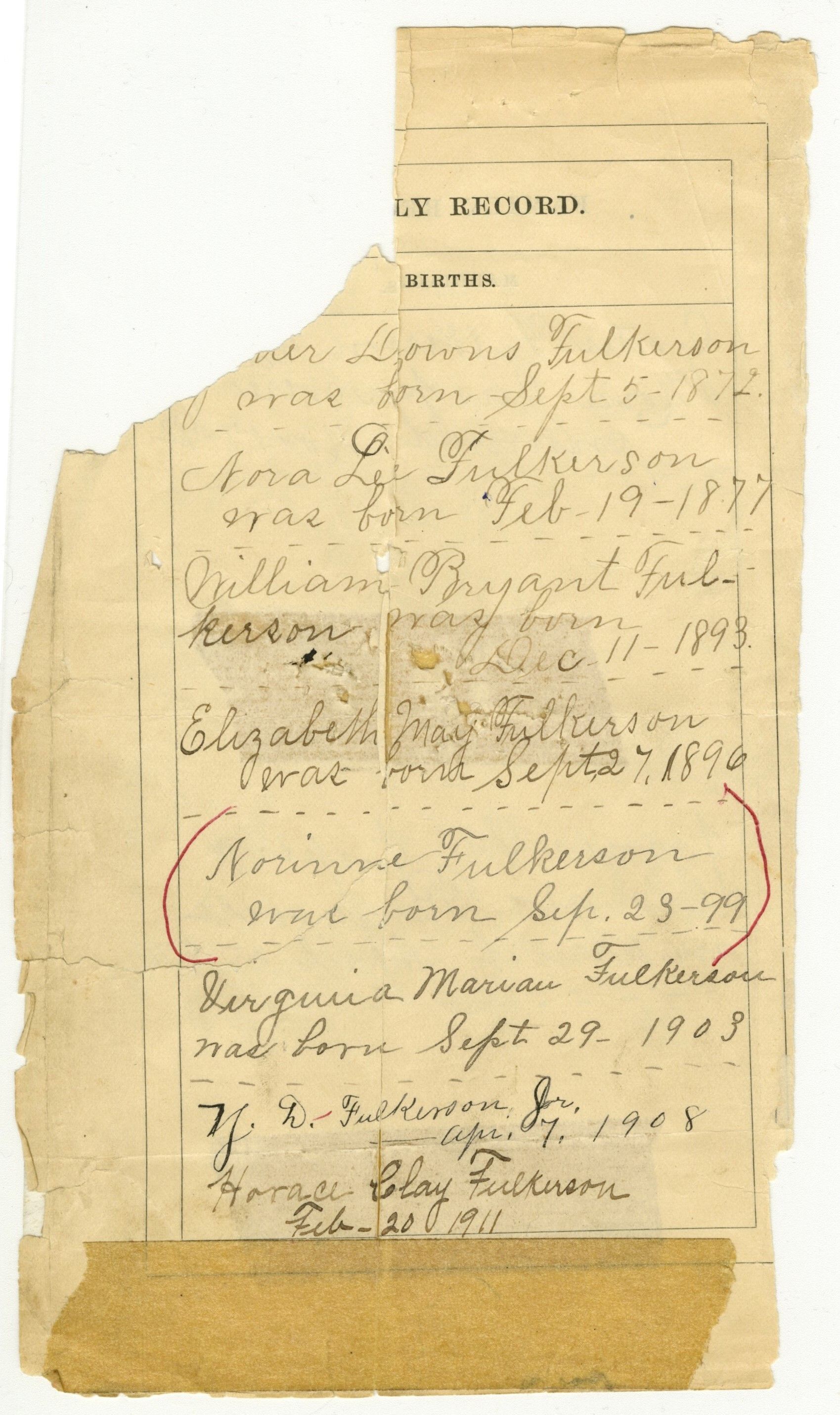 Two Pages of Fulkerson Family Records from Family Bible