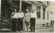 Black and white photograph of a group of four men wearing business clothing standing outside of a house.