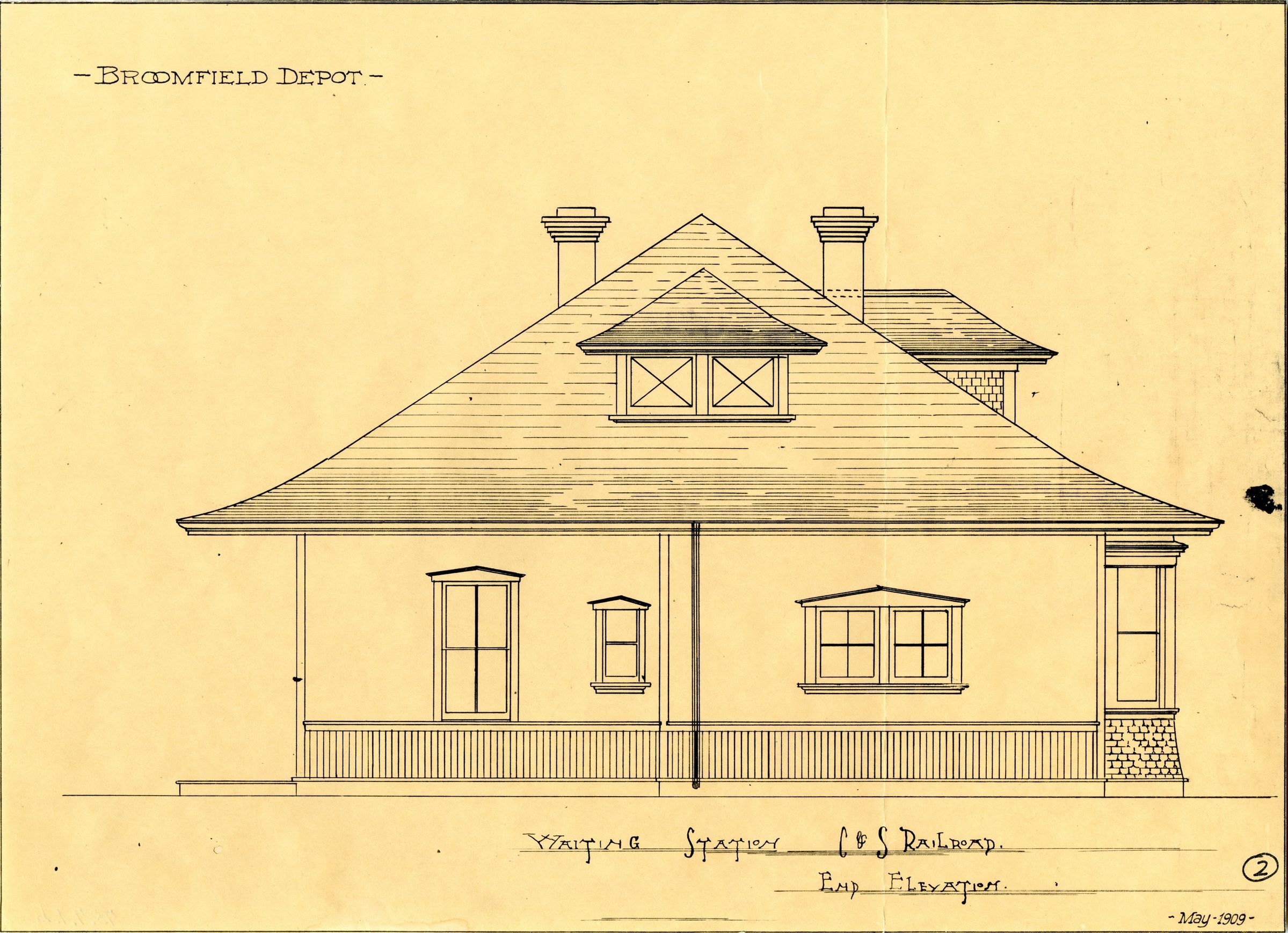 1975.7.1b has the printed title "Waiting Station C & S Railroad" under the design. Printed letters "End Elevation" can be seen just below the blueprint title. "Broomfield Depot" is printed above the design, to the left. A circled number "2" is seen near the lower right corner, above the date. The image appears to be the back view of the depot, with four downstairs windows and one upstairs window to the children's bedroom visible. A black splotch is on the right side of the print. The scale is 1/4" = 1 foot.Collection