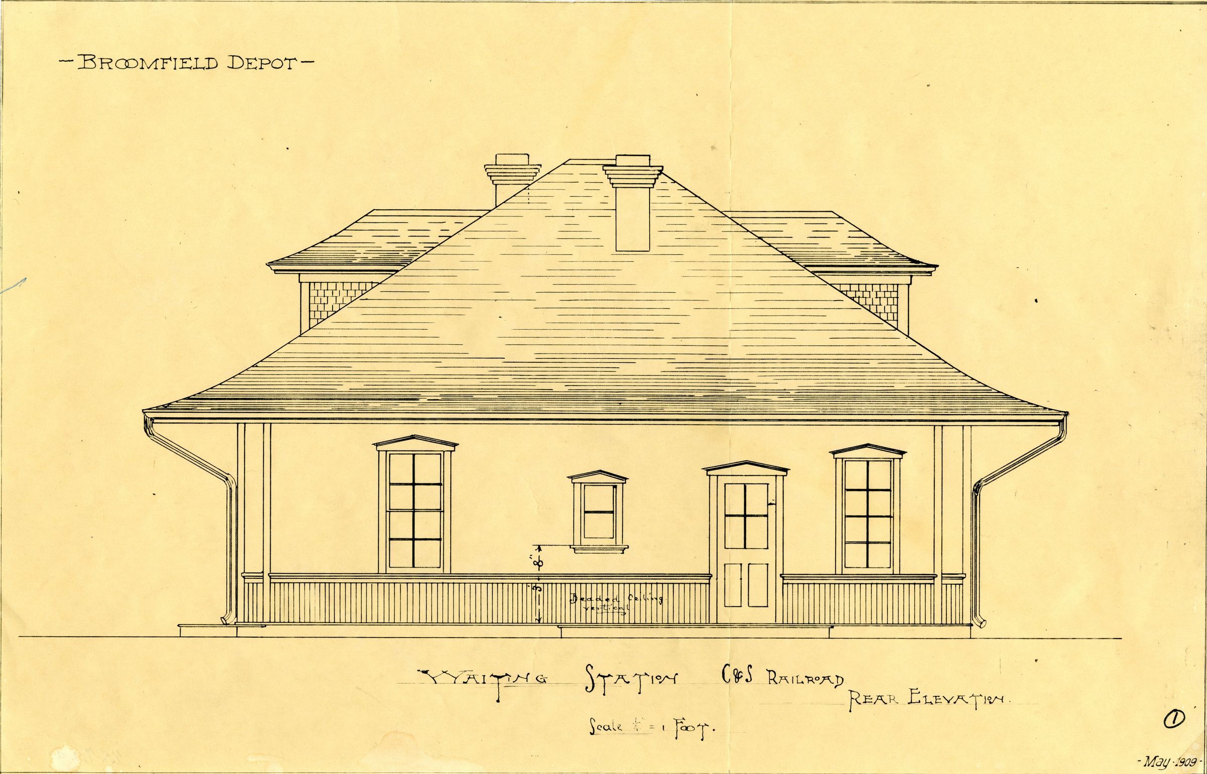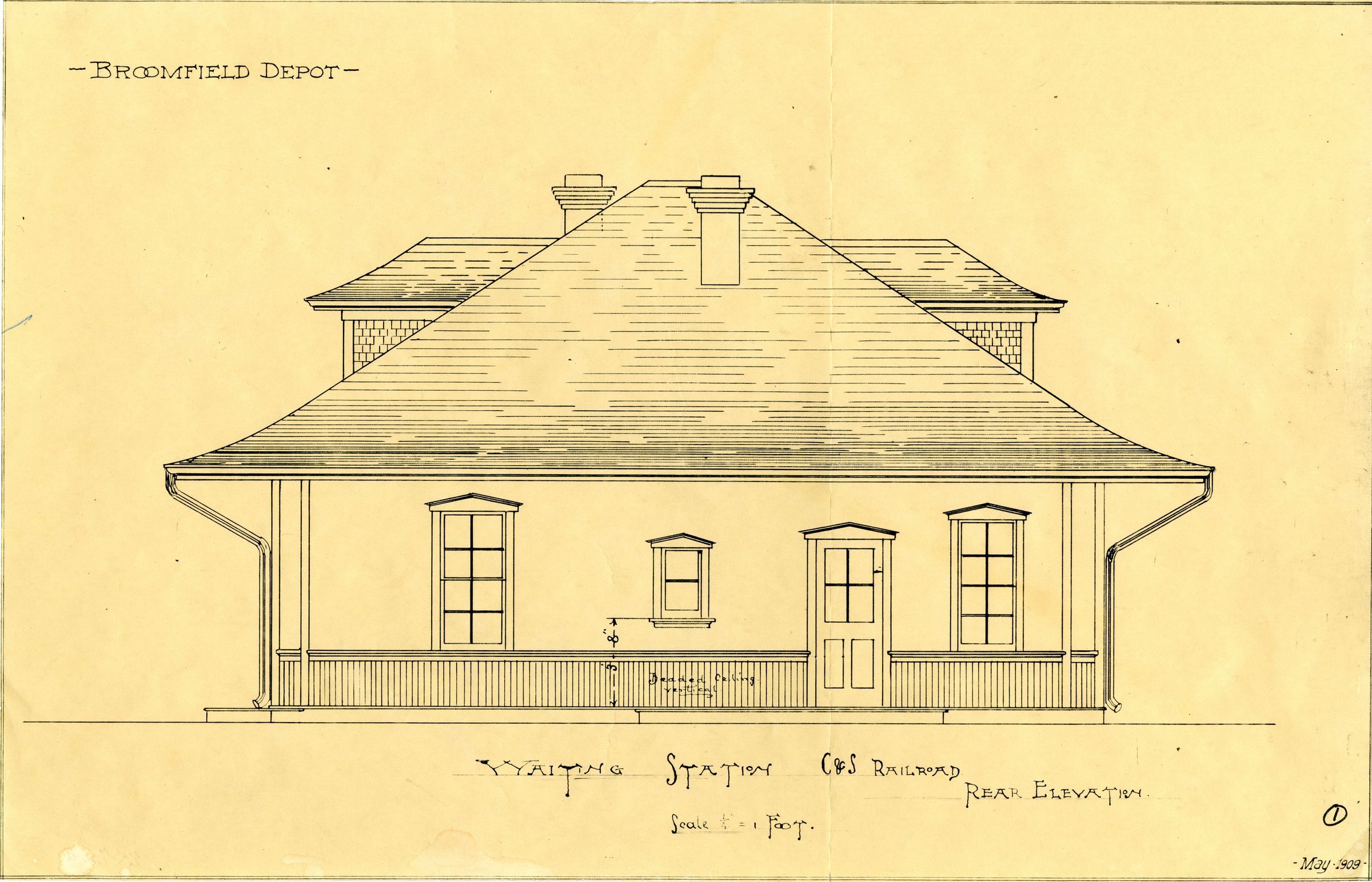 1975.7.1a has the printed title "Waiting Station C&S Railroad" under the design. Printed words "Rear Elevation" can be seen just below the title. "Broomfield Depot" is printed above the design, to the left. A circled "1" is near the lower right corner, above the date. The image on the design appears to be the waiting room side of the depot, with one door visible. The writing "Beaded Ceiling Vertical" is seen under the center window. The scale for the blueprint is 1/4" = 1 foot.Collection
