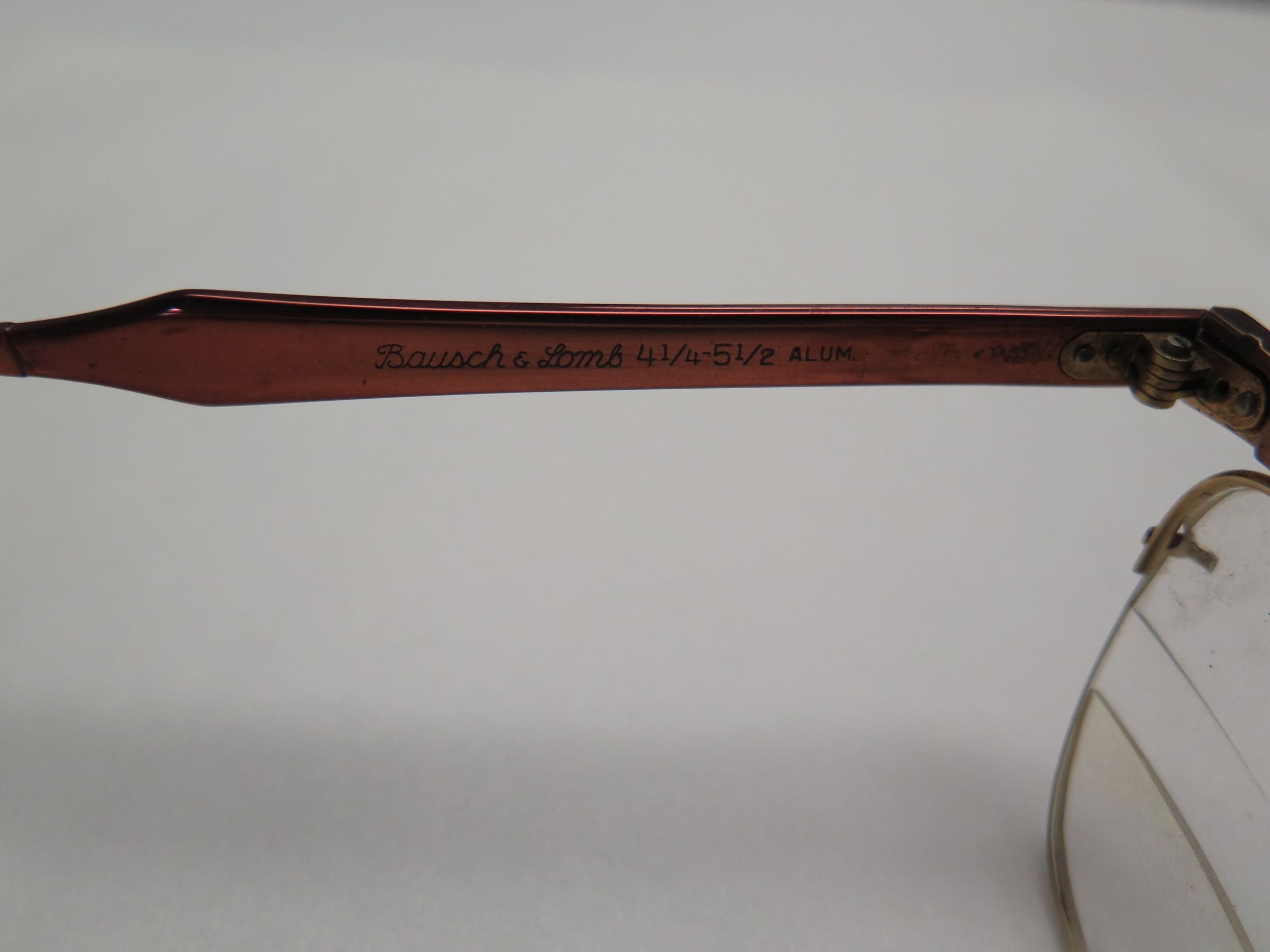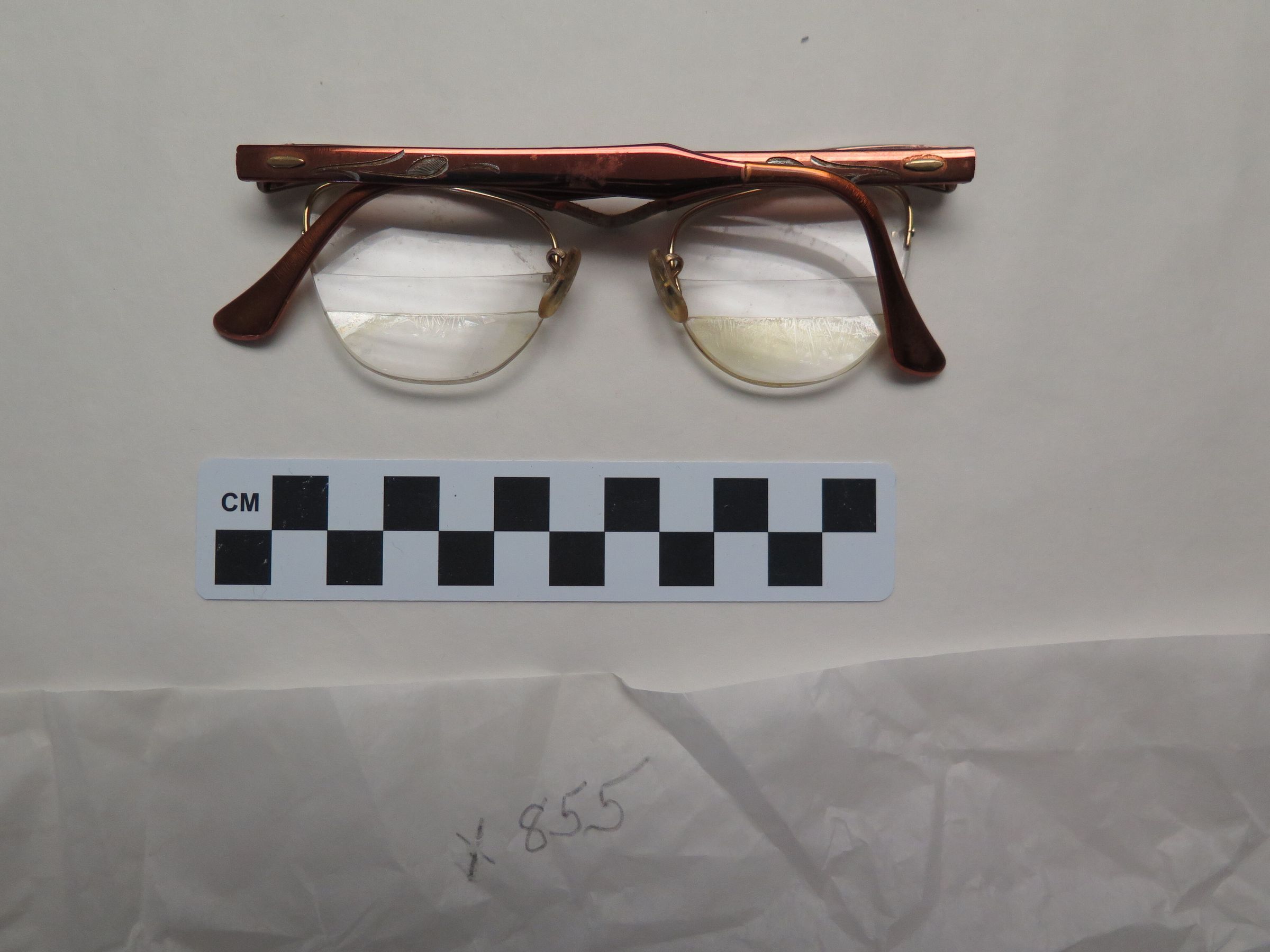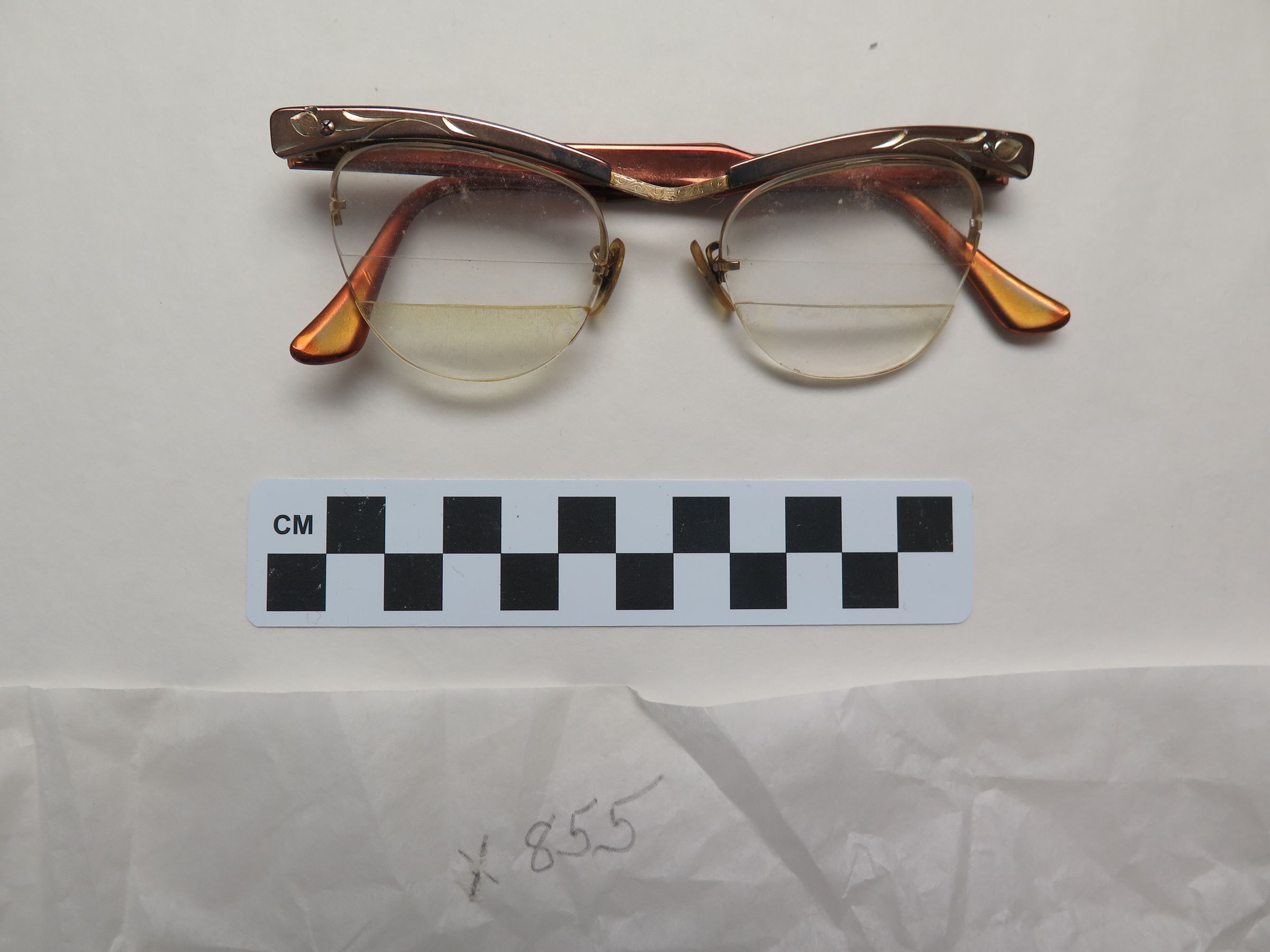 This is a pair of bifocal eyeglasses with metal and plastic frames. The eyeglasses measure 0.5" (h) x 6.25" (w) x 2" (d).
