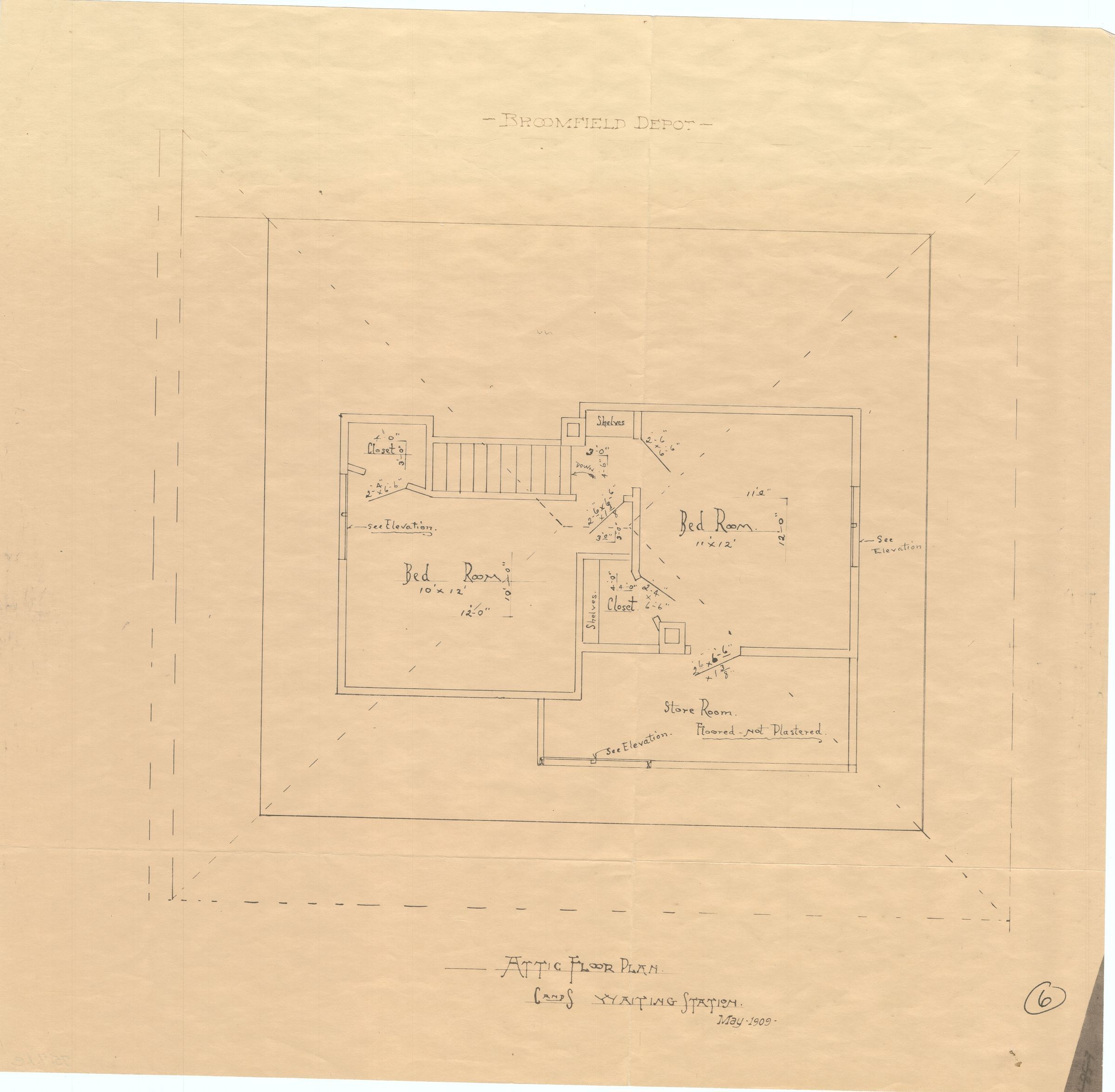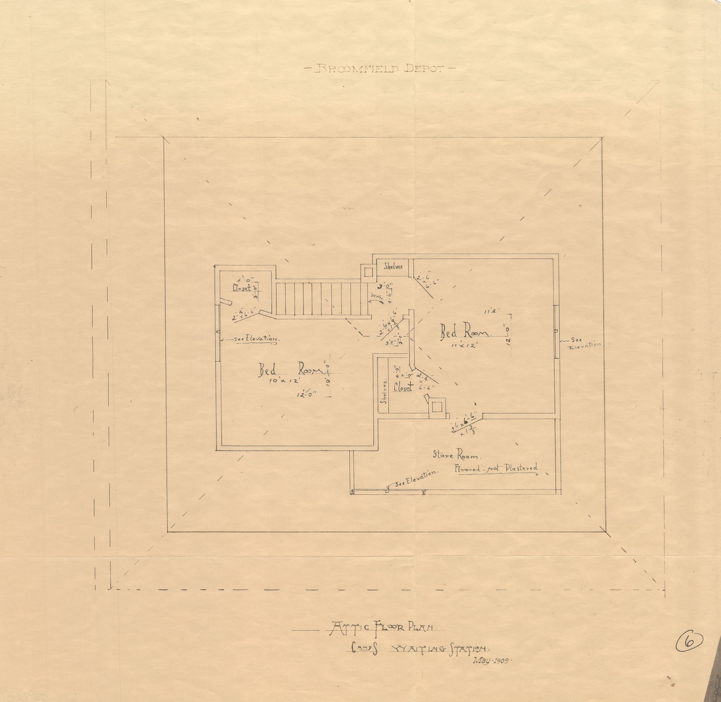 1975.7.1e has the printed title "Attic Floor Plan. C and S Waiting Station" at the bottom of the design, with the date just below it. "Broomfield Depot" is spelled out at the top of the design. A circled number "6" is in the lower right corner, with old crossed out numbering next to it. The attic design shows two bedrooms and the store room.Collection