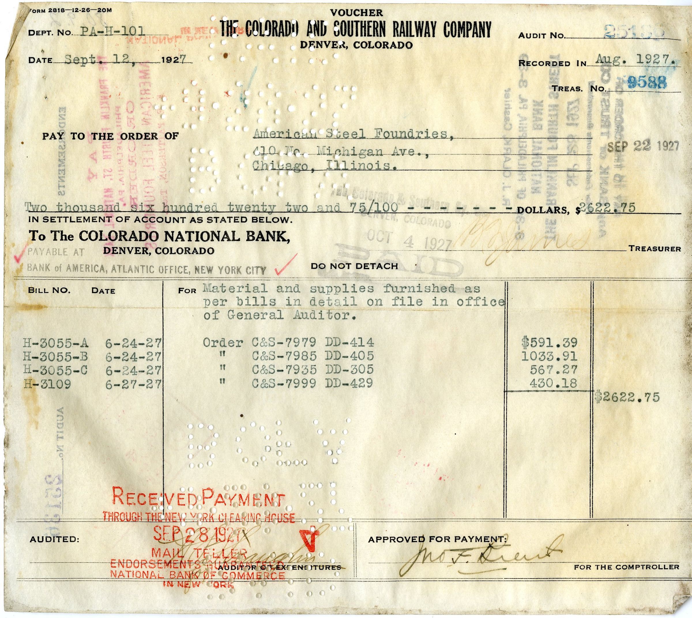 5 Colorado and Southern Railroad financial vouchers for supplies and materials from American Steel Foundries, Armour and Company, Electrical Supply Co., The Gall Auto Specialty Co., and Duncan Bond & Company, 1927. The signatures on the vouchers are from Jns (John) F. Brent, Treasurer; B.J. James, Treasurer; Mo. F. Brent, for the comptroller; and W.P. Straughn, auditor.Collection