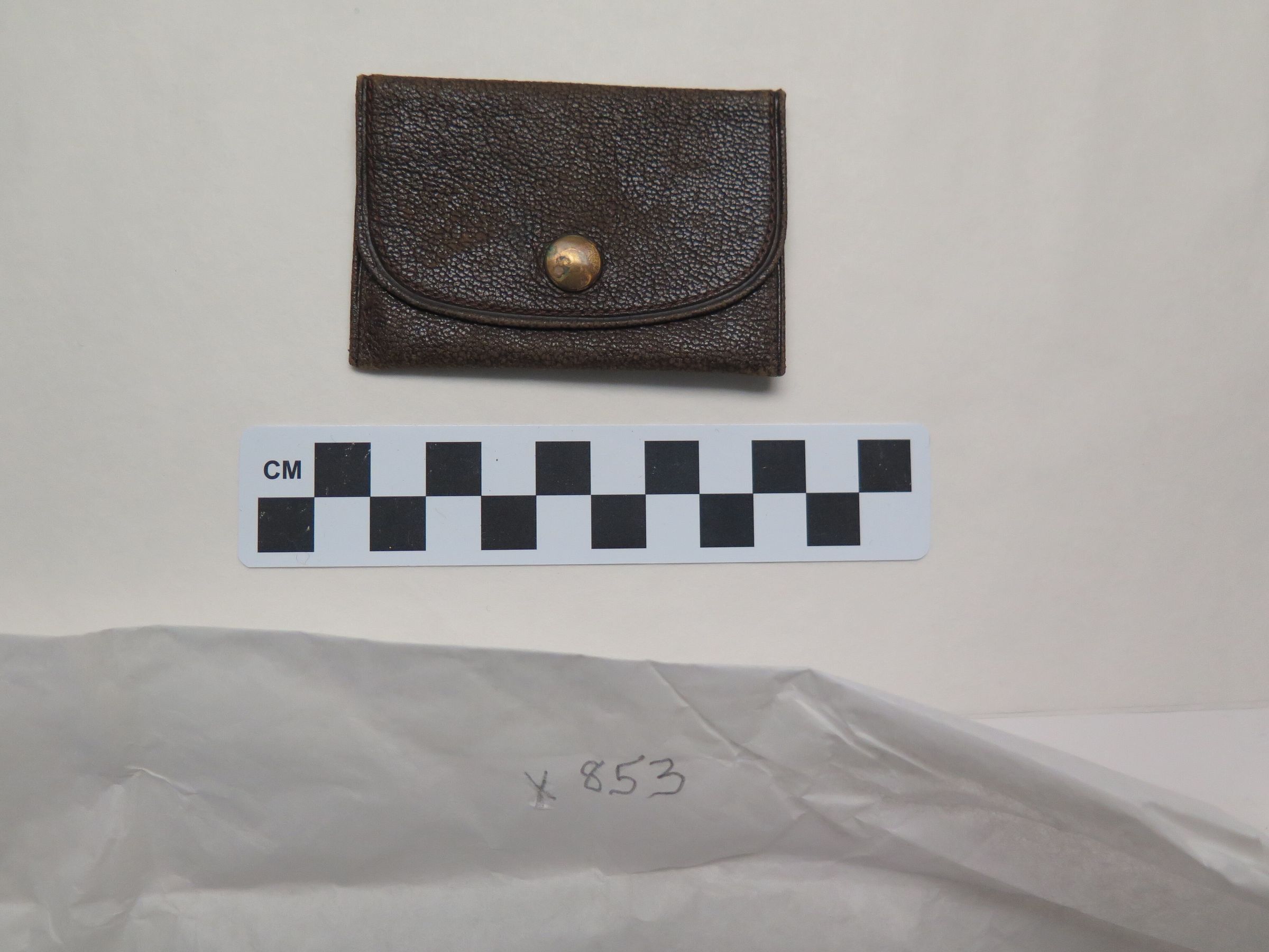 This is a brown leather pouch with a snap closure on the front. The pouch measures 2" (w) x 3" (l).