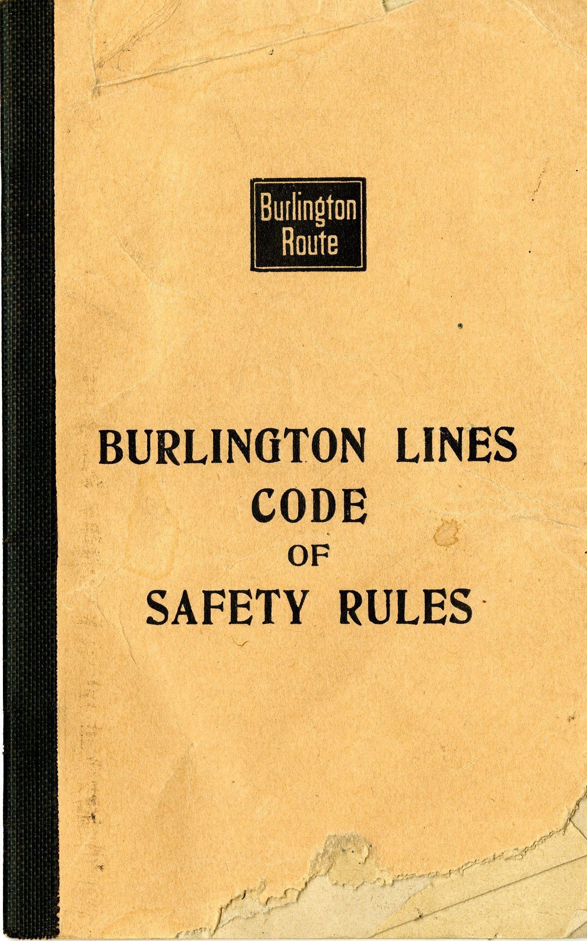 Booklet titled Burlington Lines Code of Safety Rules, for the Burlington Route. The rules applied to the Chicago, Burlington & Quincy Railroad Company; The Colorado & Southern Railway Company; Fort Worth and Denver City Railway Company; and The Wichita Valley Railway Company. They took effect on September 1, 1931. The booklet was reprinted in 1941. The booklet belonged to James D. Hutchison, who worked for the Colorado and Southern Railway Company as a telegrapher and relief agent. He was trained by Clarence Vaughn, an agent for the Broomfield train depot. Hutchison's name is written in pencil on the inside cover, upper left corner.