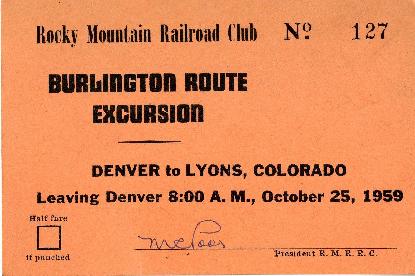 A train ticket for the Burlington Route Excursion from Denver to Lyons, Colorado, dated October 25, 1959. The ticket was for an 8 am departure. The ticket is signed "McPoor," President of the Rocky Mountain Railroad Club (R.M.R.R.C.). The ticket is also labeled at the top with the club name. It is stamped with the number 127 in the upper right corner. In the lower left corner, a square labeled "Half fare if punched" is printed. The reverse side is blank.