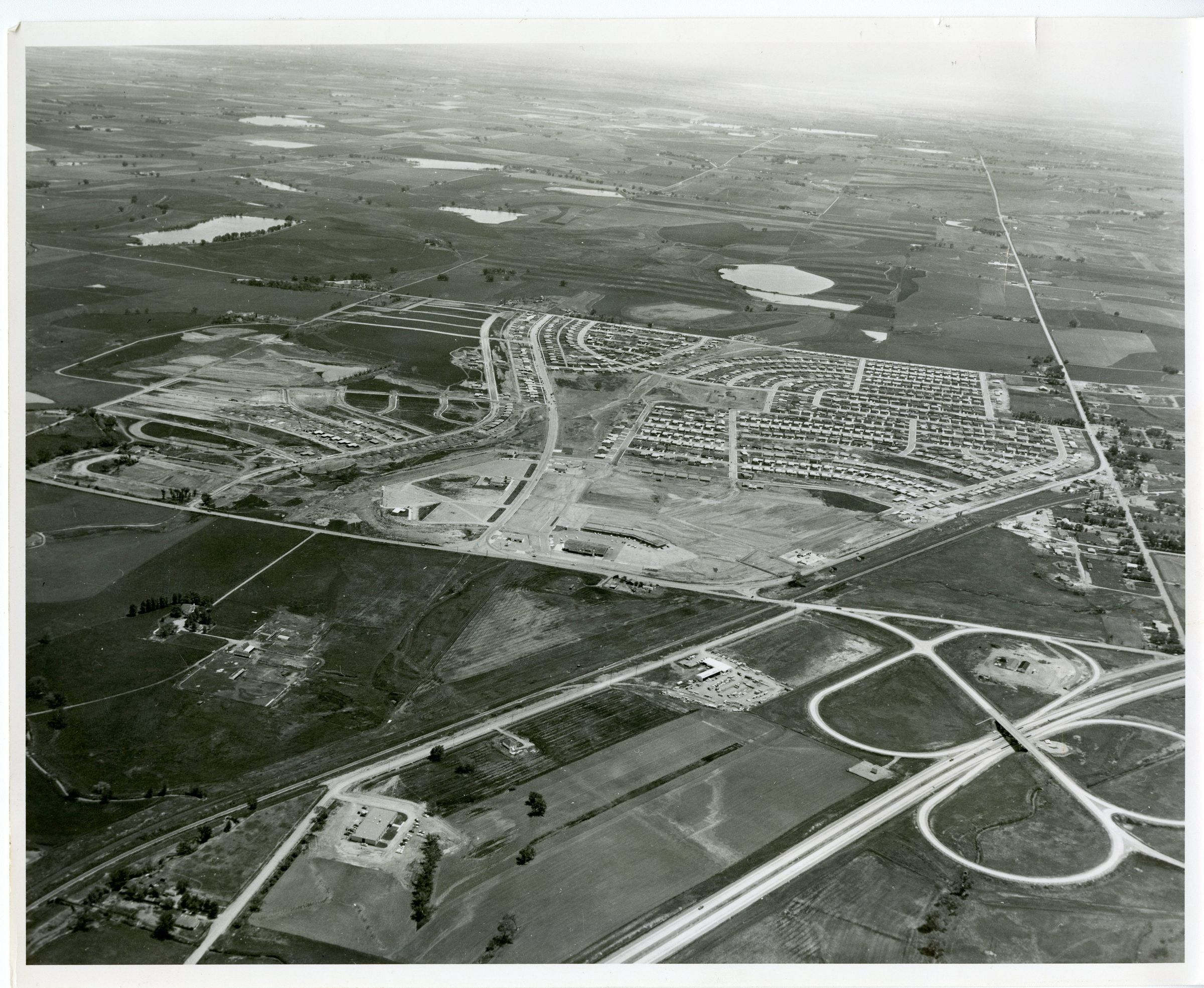 Black and white photograph of Broomfield CO, looking NW in 1958. Some of the buildings include Colorado Research in the lower left corner, and Broomfield Lumber.