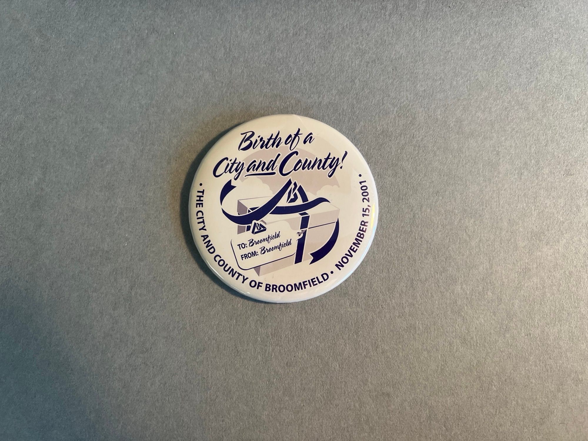 A large white button pin with blue text and images commemorating the founding of the City and County of Broomfield on November 15, 2001.