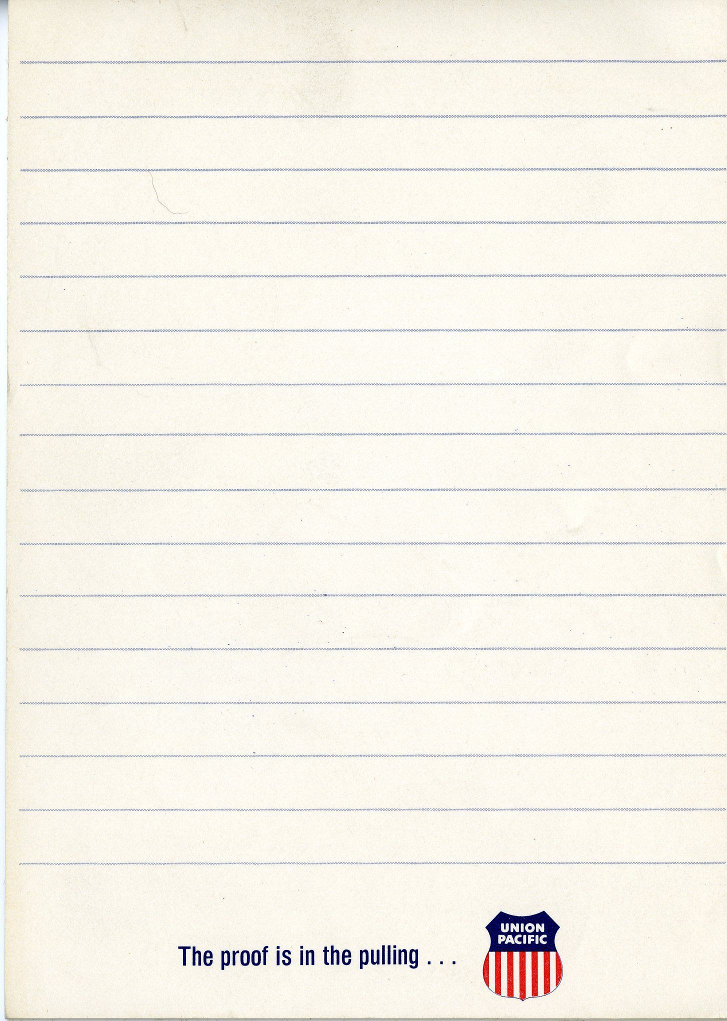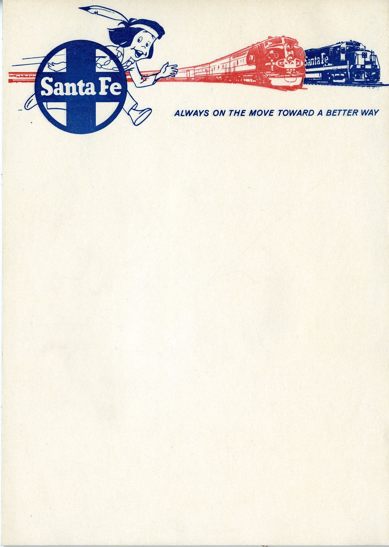 Two paper note pads, 5" x 7" for the Atchison, Topeka, and Santa Fe Railroad and Union Pacific Railroad, circa 1950s. The Santa Fe pad has the railroad company's blue Santa Fe logo, with a cartoon Native American mascot running behind it. There are two trains, one red and one blue, side-by-side next to the mascot. The pitch, "Always on the Move Toward a Better Way" is stated below the trains. The Union Pacific pad is lined, with the Pacific Union logo resembling a badge with American flag designs near the lower right corner. The pitch, "The Proof is in the Pulling..." is at the bottom of the page. The page designs are the same on each page of the pads.Collection