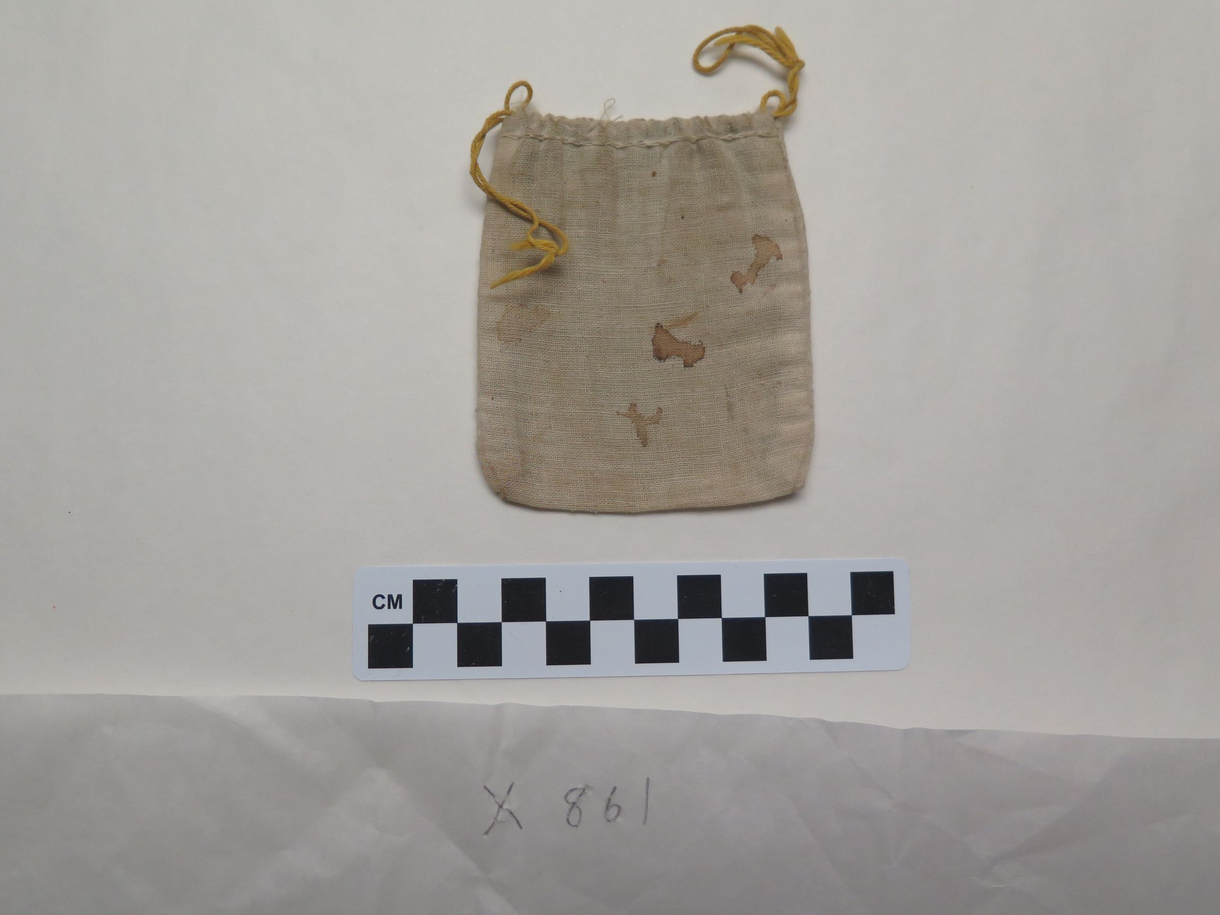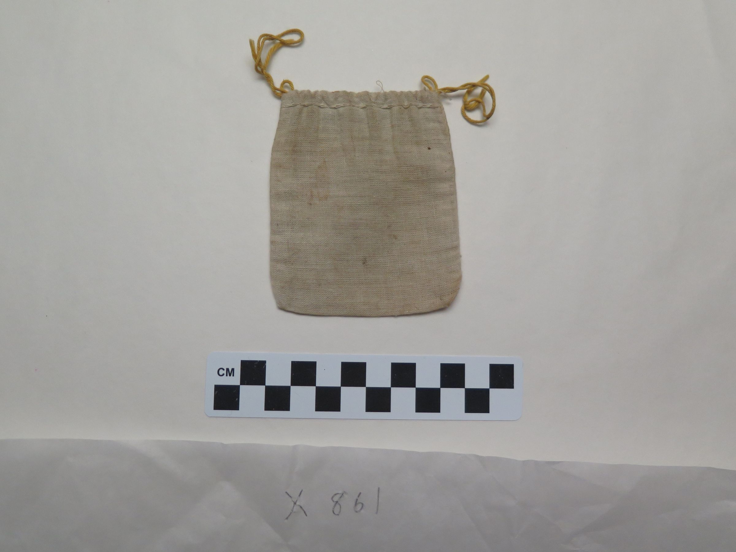 This is a linen pouch with a yellow drawstring closure on top. The pouch measures 3" (w) x 3.5" (l).