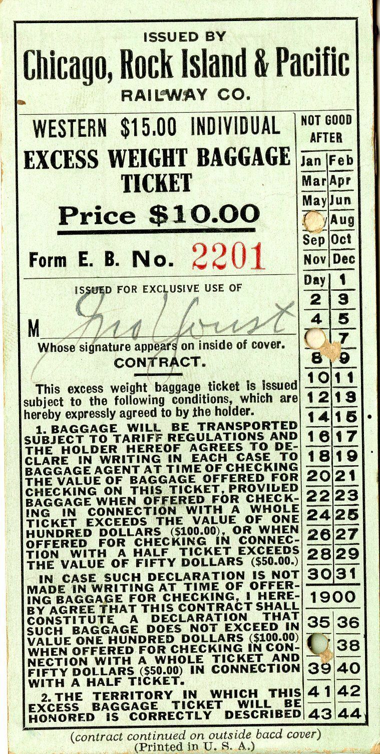 Excess Weight Baggage Ticket for the Chicago, Rock Island & Pacific Railway Co. from July 6, 1937. The ticket is green and folded, on card stock, with the date punched out along the right edge. The price listed was $10.00, with a red stamped number 2201. Various ticket prices on paper are glued to the ticket and folded on the inside. It is signed by "Mo Youst" on the front, and again inside. M.R. Peck, ticket seller, has also signed on the inside.Collection