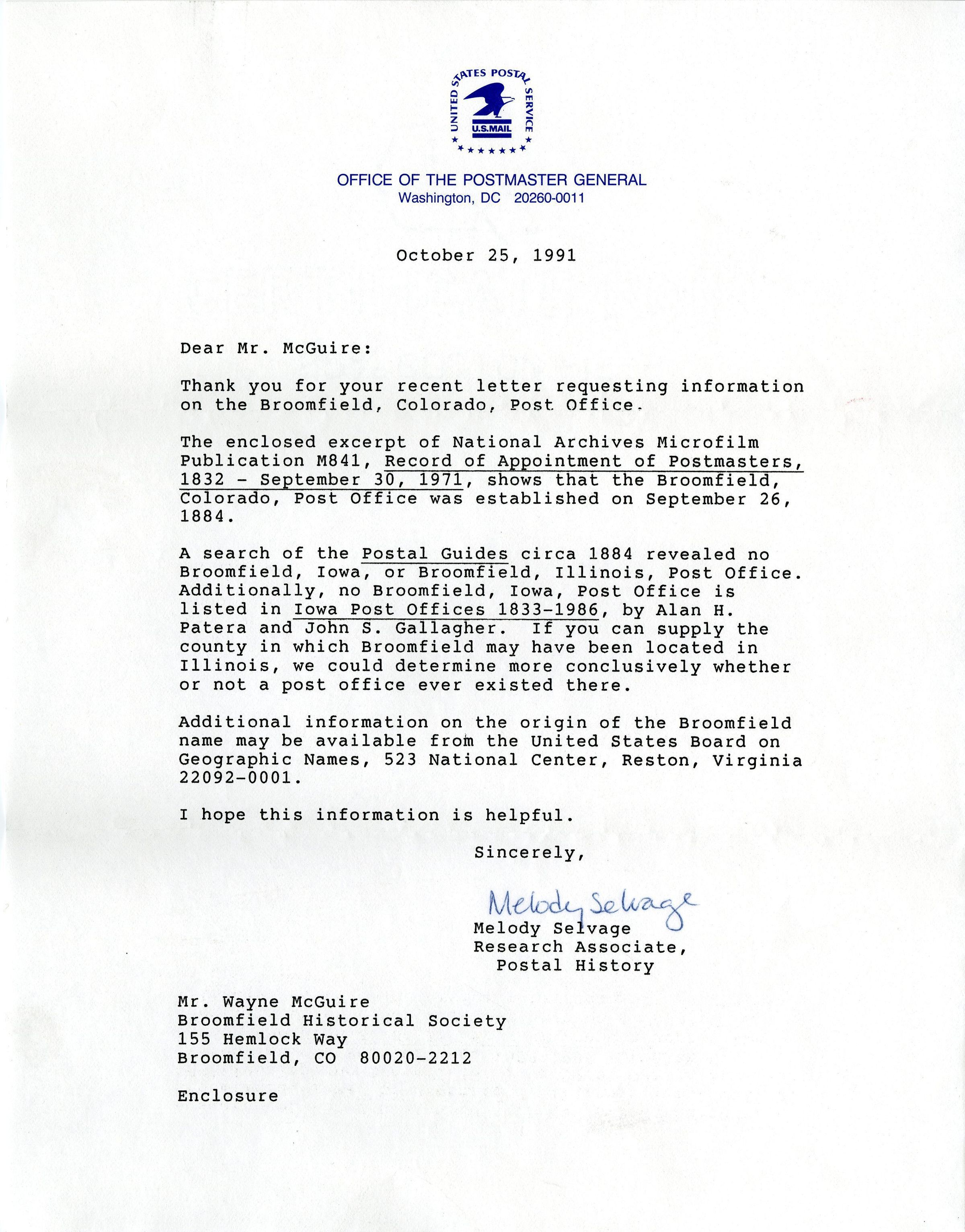 The second letter originally came from the United States Postal Service in 1991, following an inquiry by Broomfield Historical Society member Wayne McGuire, husband of Society President Karen McGuire. The letter was written by Melody Selvage, a Research Associate of Postal History with the USPS. The letter gives details into how Broomfield's first post office may have been one source of the town's name in the 1800s.