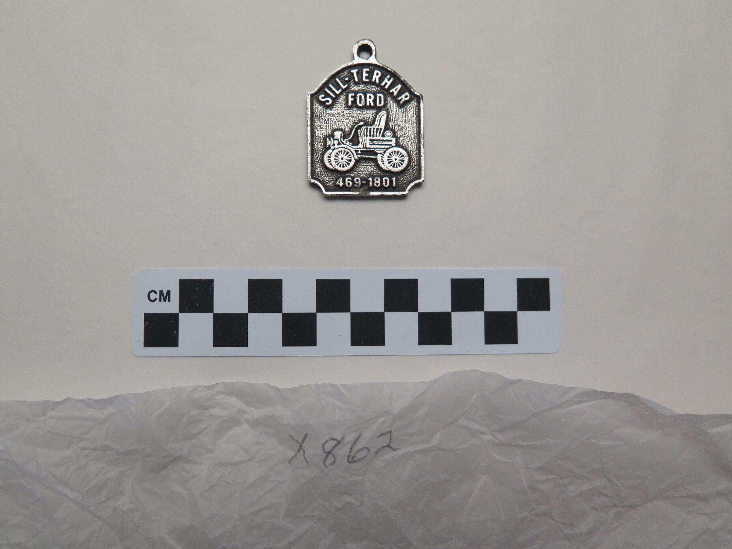 This is a metal key chain. The front of the key chain has the image of a car and the text, "SILL-TEHAR FORD" on it. The key chain measures 1.25" (w) x 2" (l).