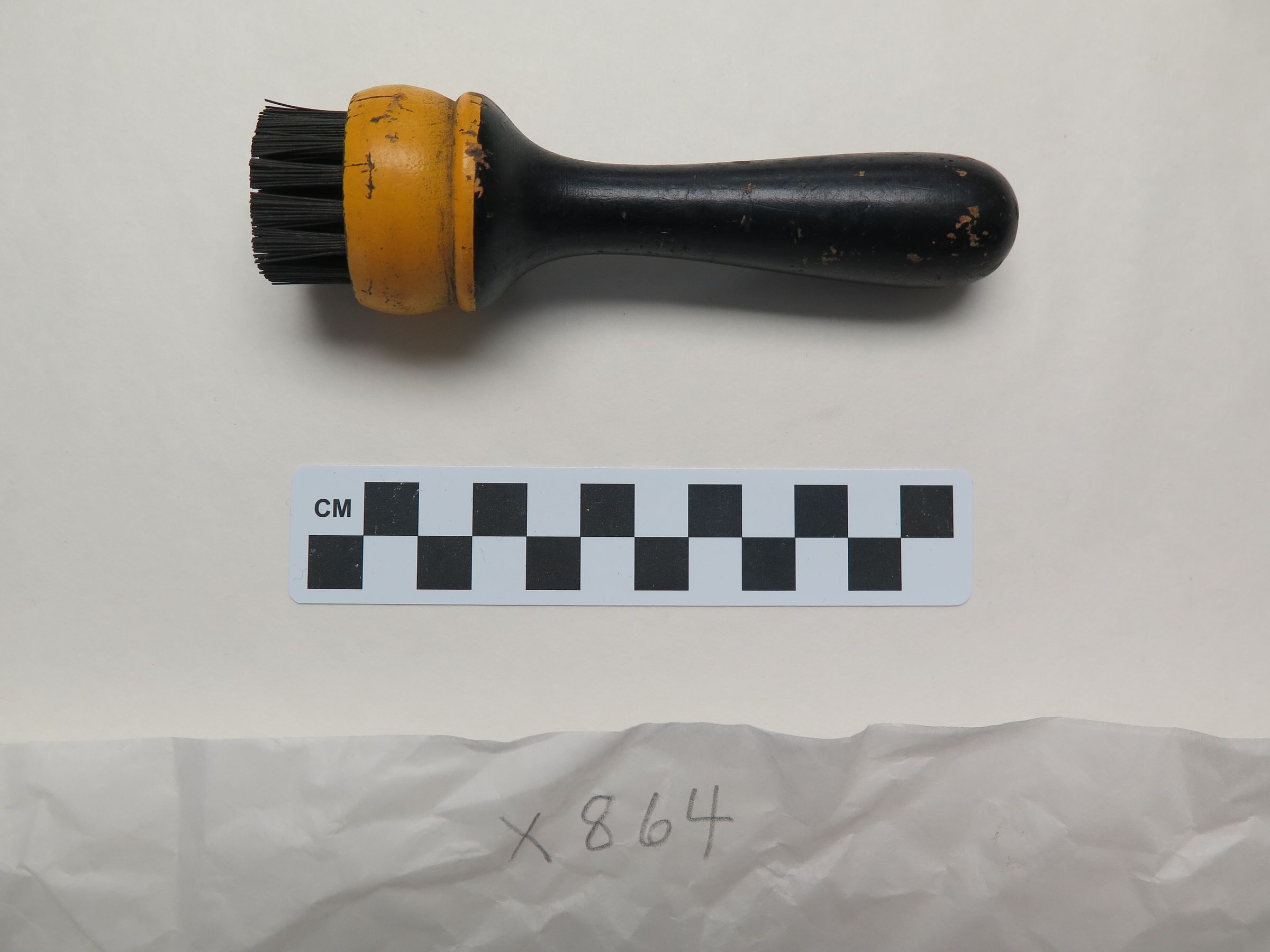 This is a round shoe brush with a wood handle. The handle has been painted black and yellow. The shoe brush measures 5.5" (l) x 2" (dia).