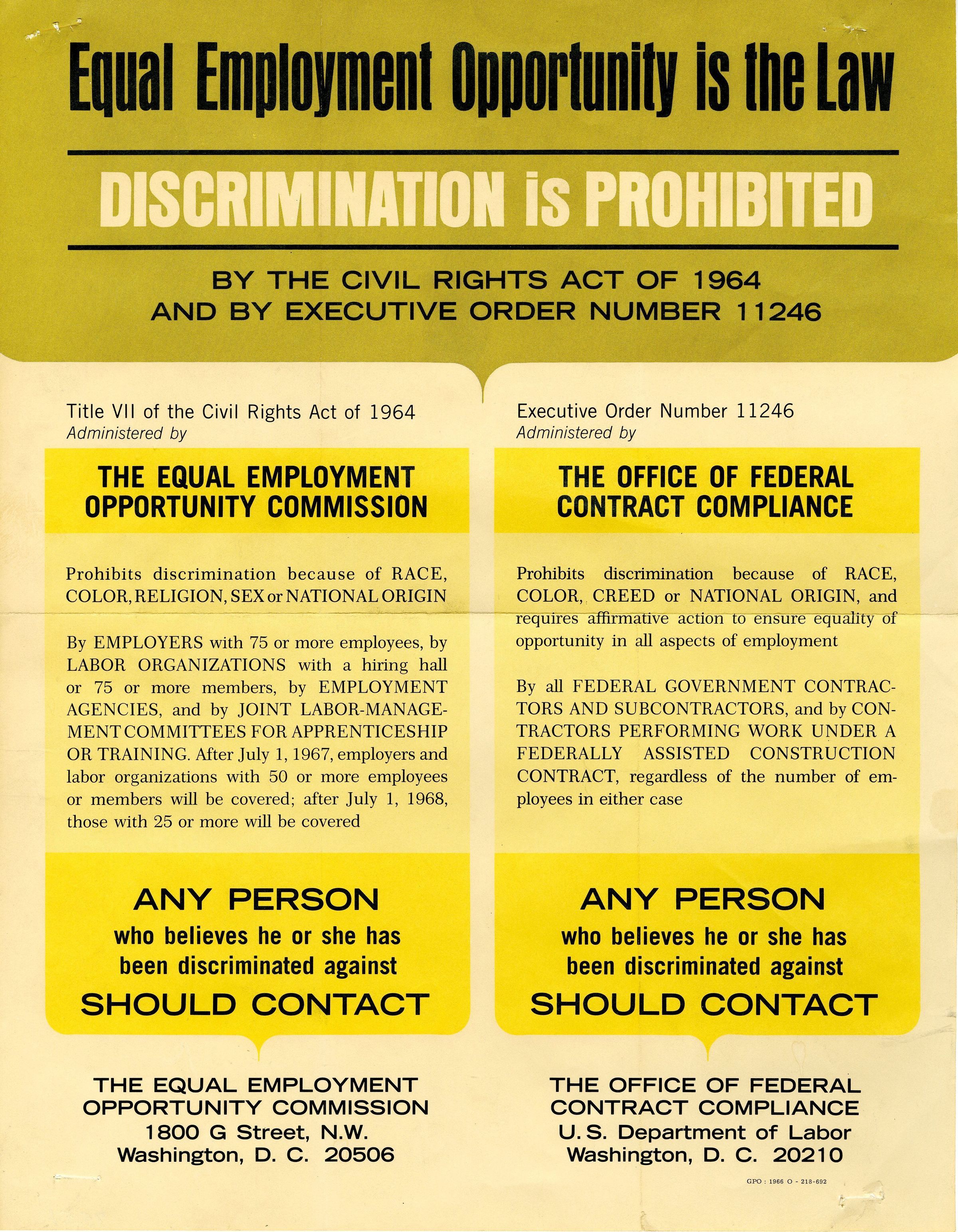One informational poster on Equal Employment Opportunity, 11" x 14," 1966. The poster was originally printed by the U.S. Government Printing Office. The poster's heading reads,"Equal Employment Opportunity is the Law. Discrimination is Prohibited. By the Civil Rights Act of 1964 and by Executive Order Number 11246." The body of text recites Title VII of the Civil Rights Act of 1964, as well as Executive Order 11246, with contact information at the bottom of the poster for the Equal Employment Opportunity Commission and the Office of Federal Contract Compliance.
