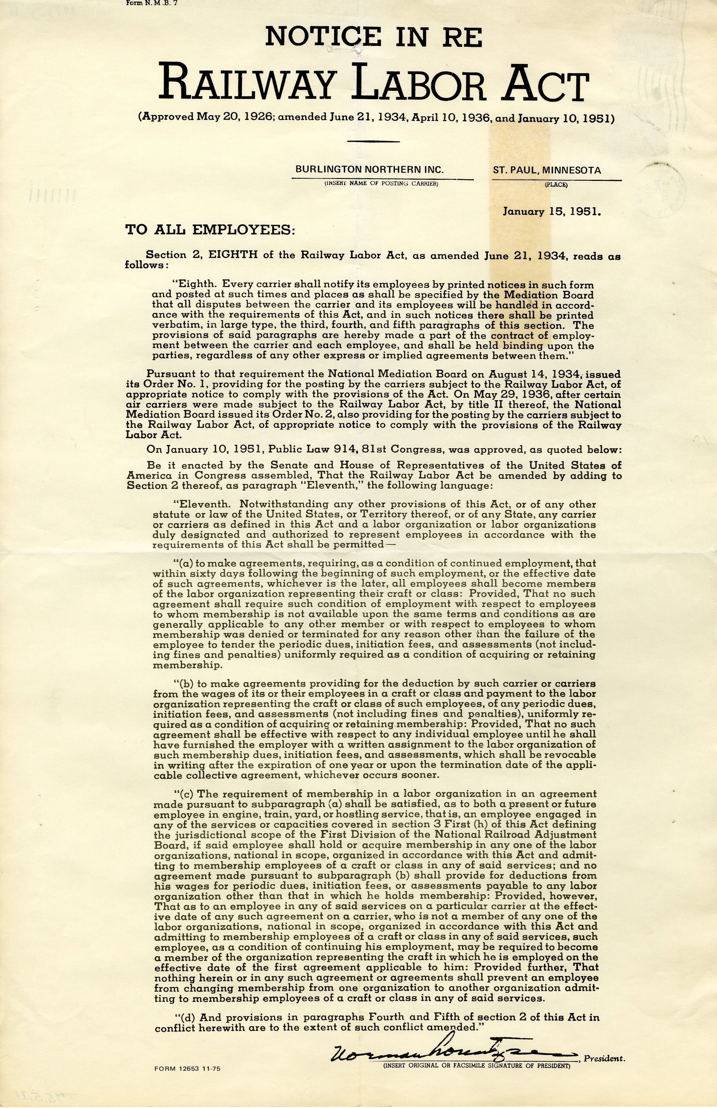 One legal notice for the Railway Labor Act, 11" x 17," 1976. The notice is for all railway employees, reciting all of section 2 of the Railway Labor Act as it was amended on June 21, 1934, as well as Public Law 914, as it was approved by the 81st US Congress on January 10, 1951. The reverse side of the notice has an address label for the Freight Agent of C&S Railway in Broomfield, Colorado, and postage stamps.