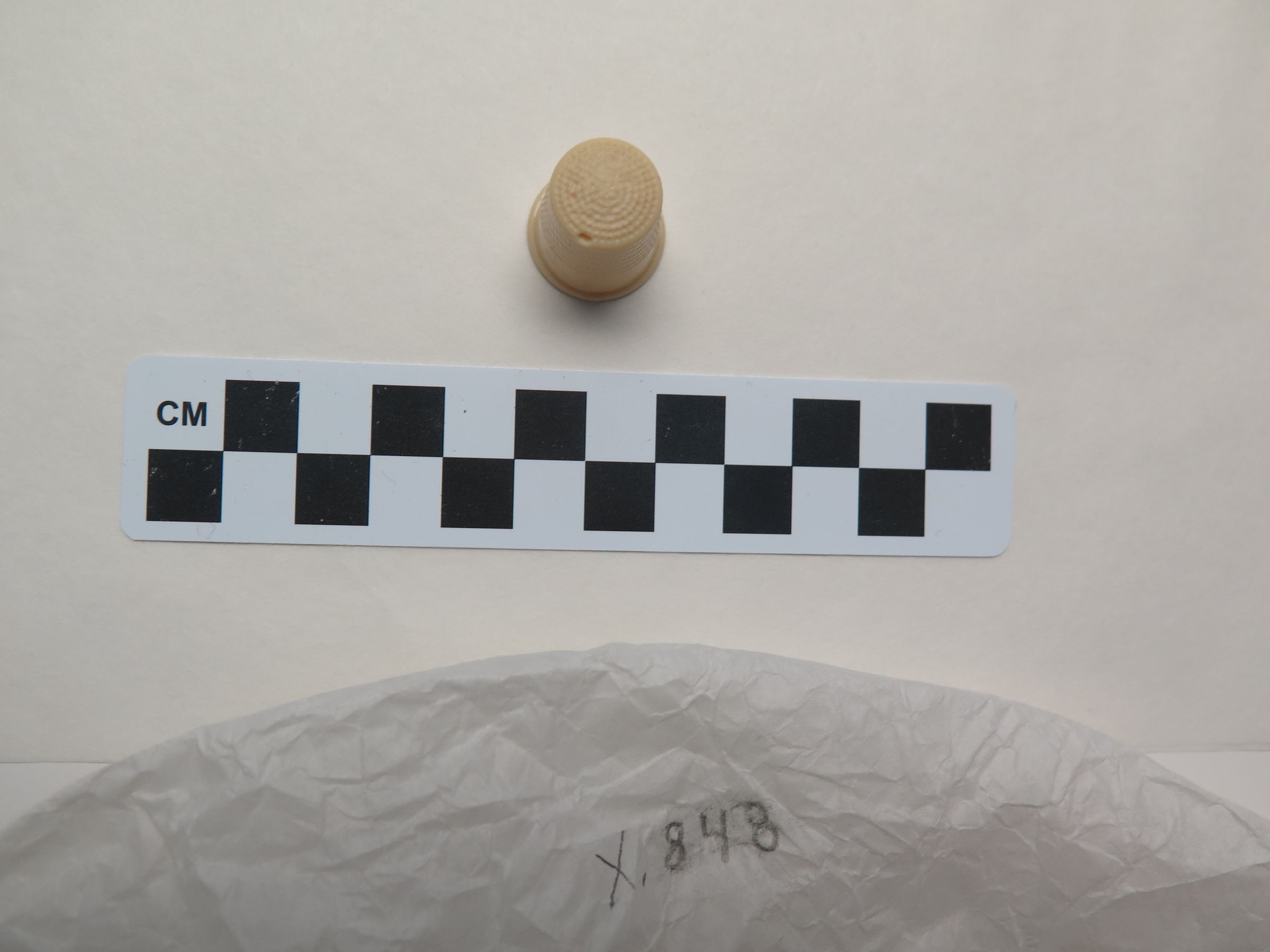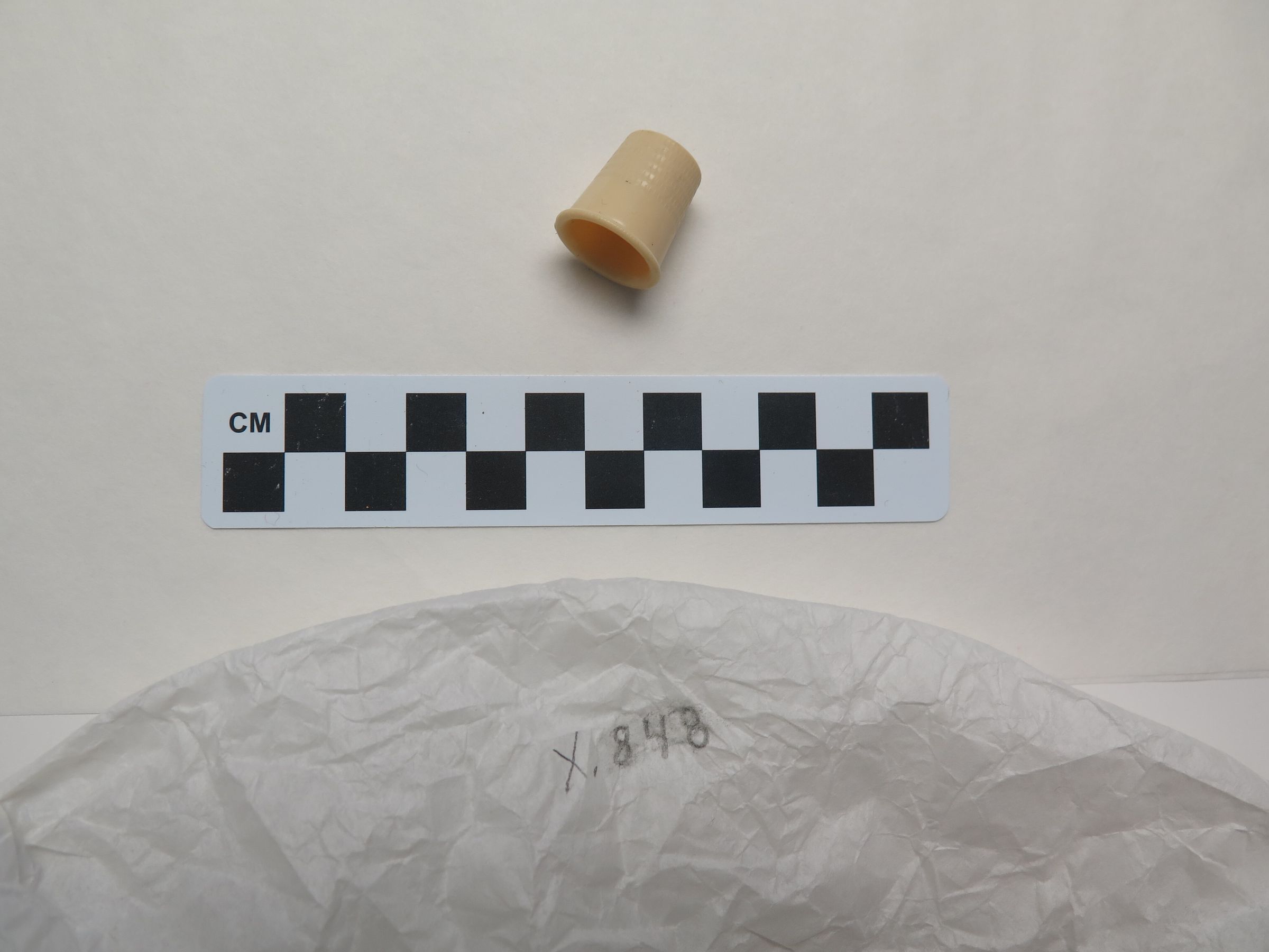 This is a cream-colored plastic thimble. The thimble measures 1" (h) x 0.75" (w).
