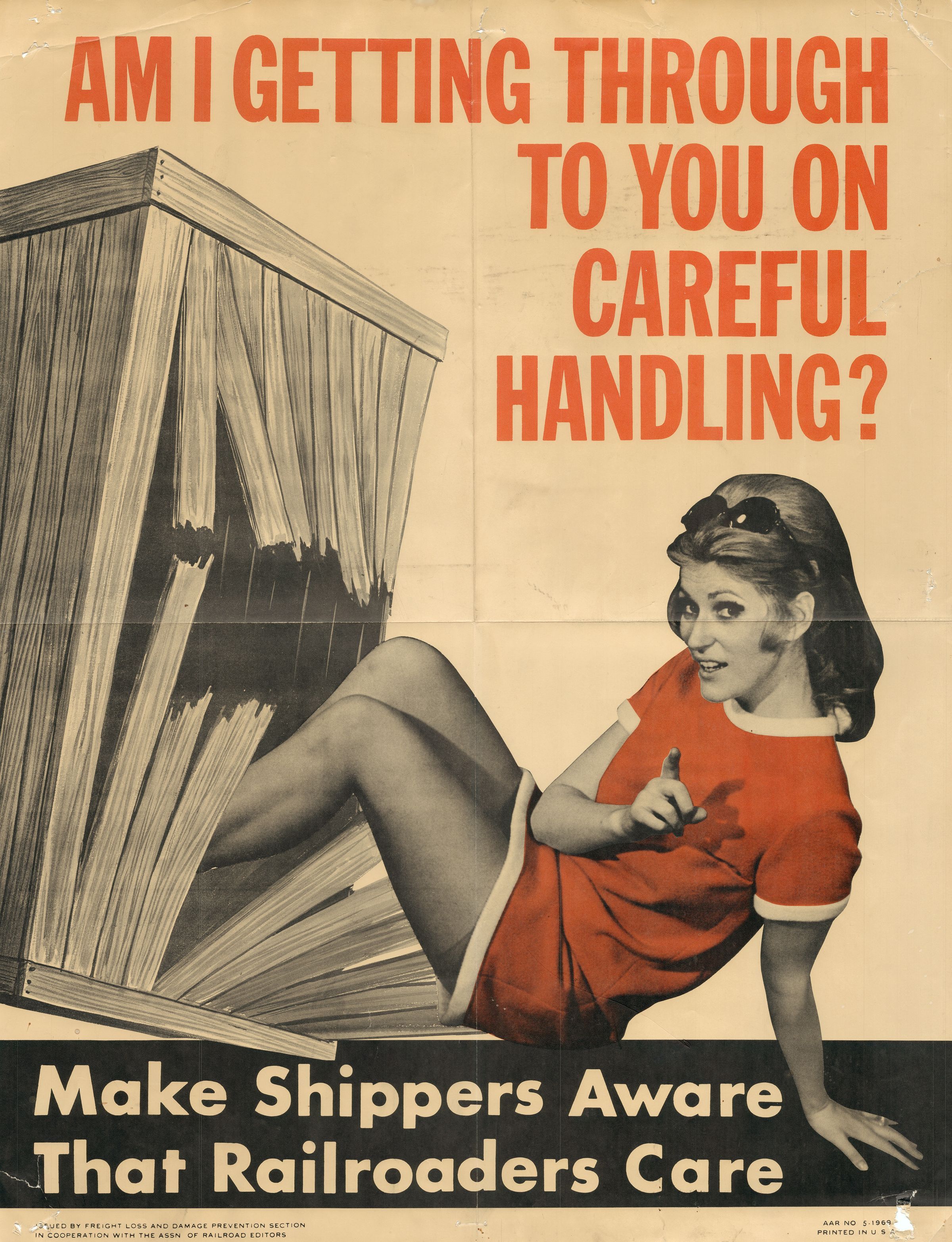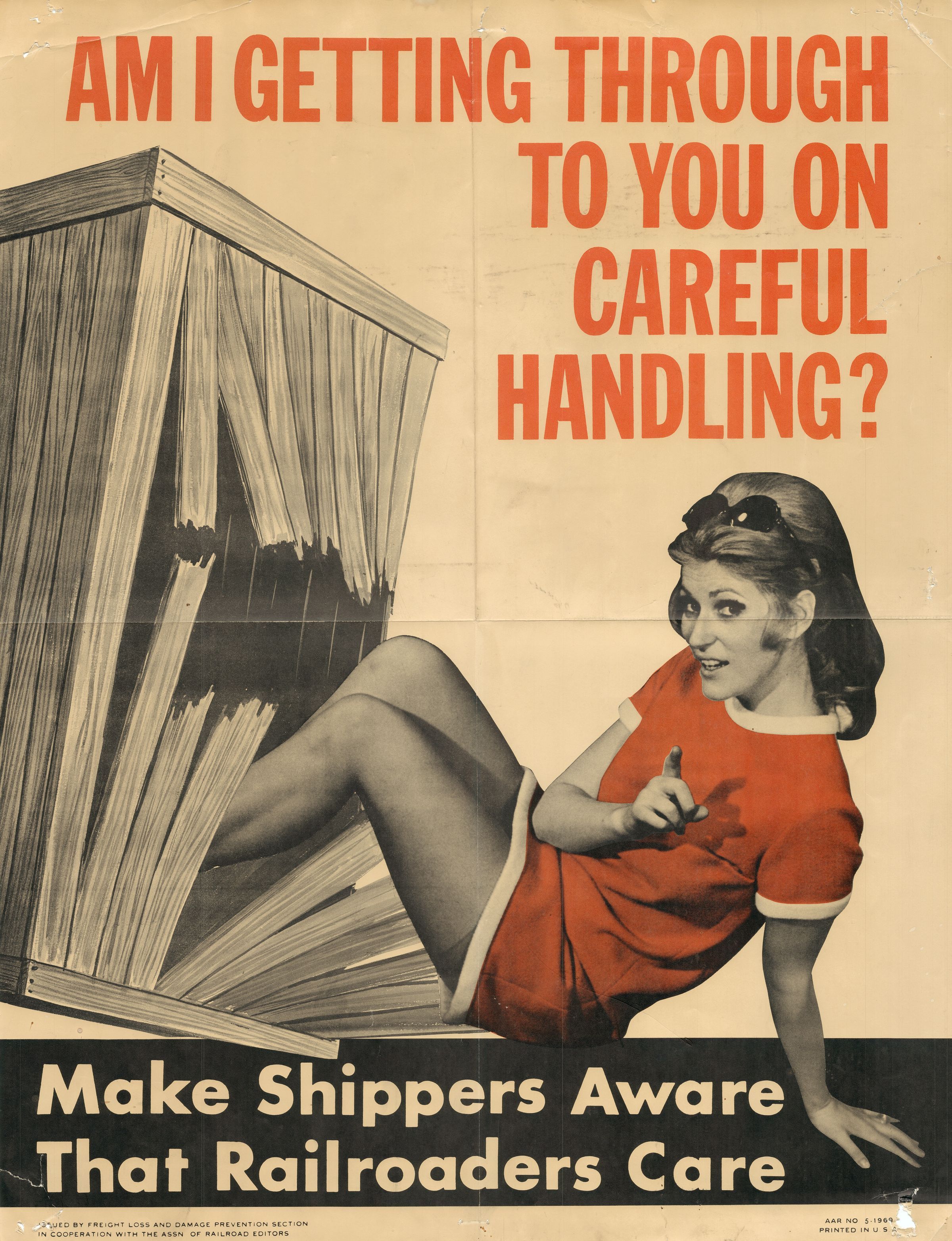 A poster telling railroad employees to reduce instances of freight damage and loss, 17" x 22," 1969. The poster was issued by the Freight Loss and Damage Prevention Section and Association of Railroad Editors, for the Association of American Railroads (AAR). The message reads,
