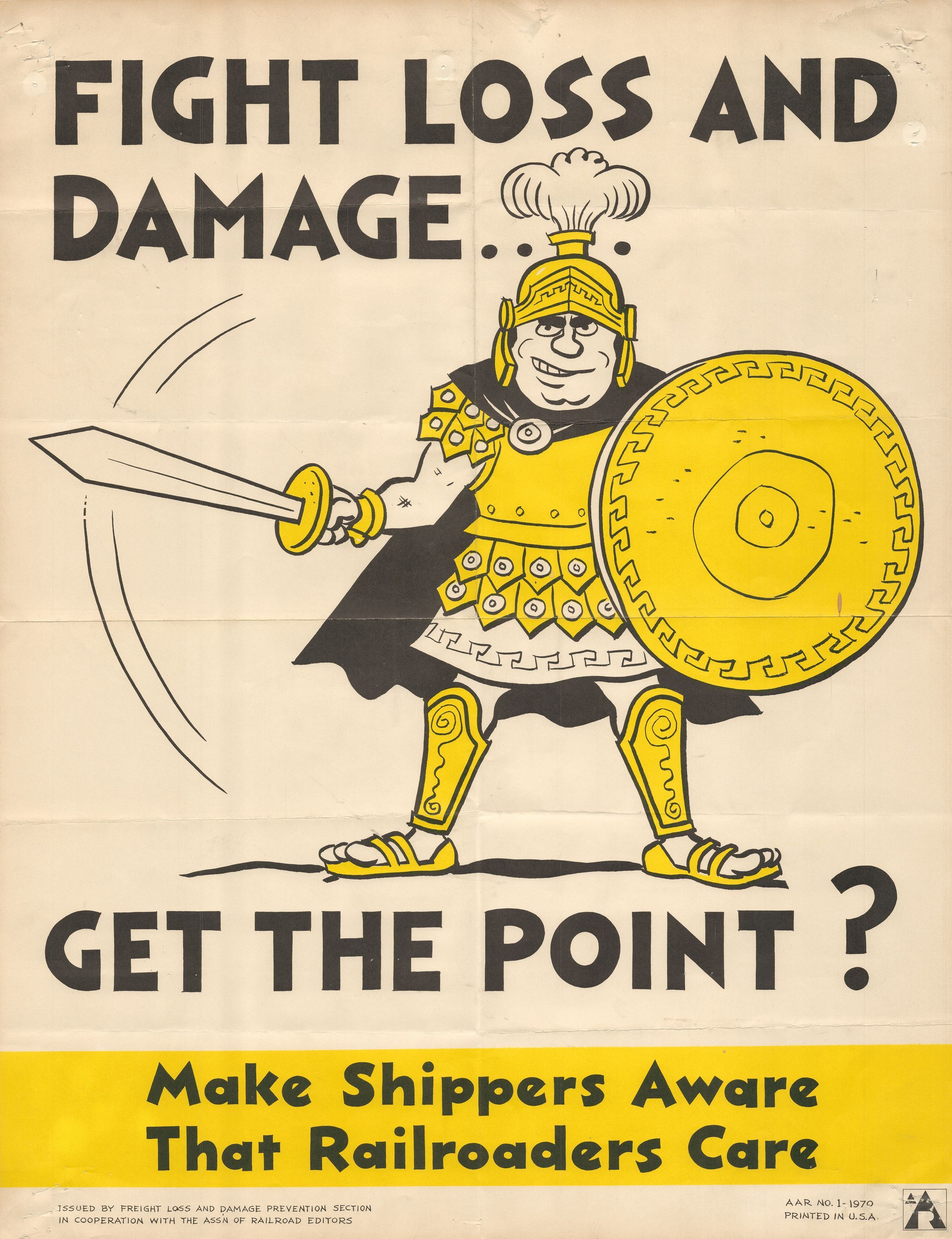 A poster telling railroad employees to reduce instances of freight damage and loss, 17" x 22," 1970. The poster was issued by the Freight Loss and Damage Prevention Section and Association of Railroad Editors, for the Association of American Railroads (AAR). The message reads,