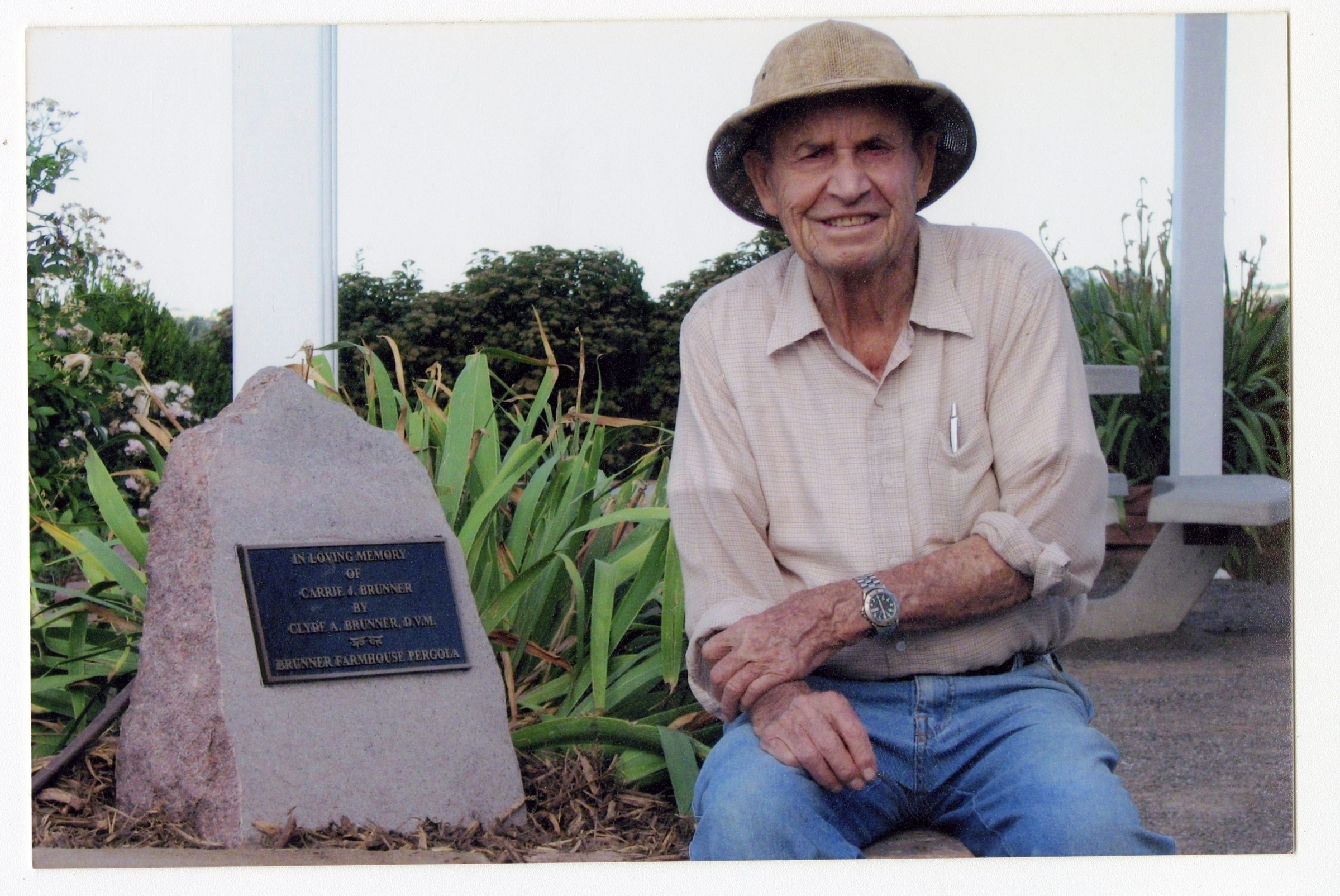 Color photograph of Clyde Brunner to the right of a memorial stone to his wife Carrie J. Brunner. Photograph possibly taken at the Brunner Farmhouse pergola.
