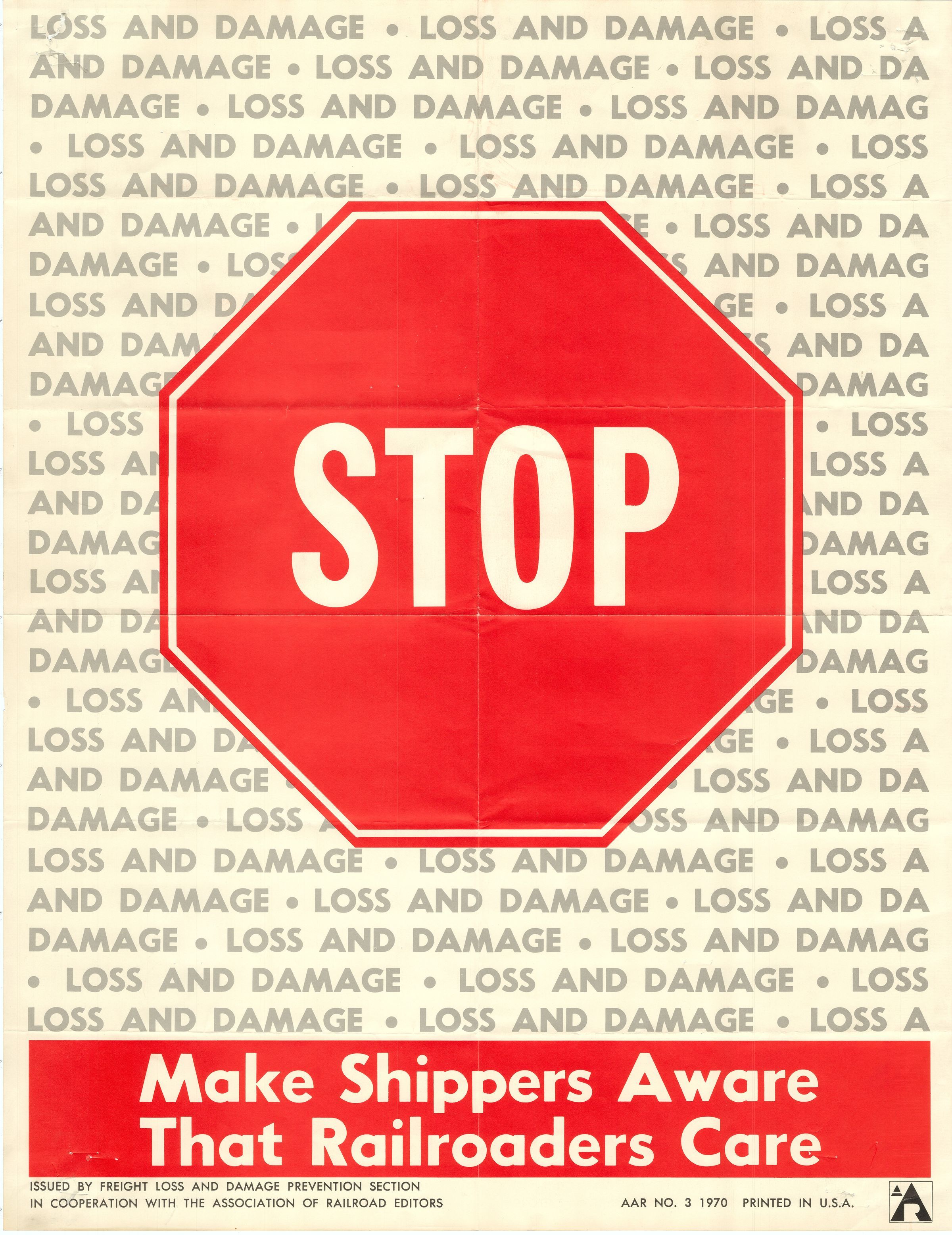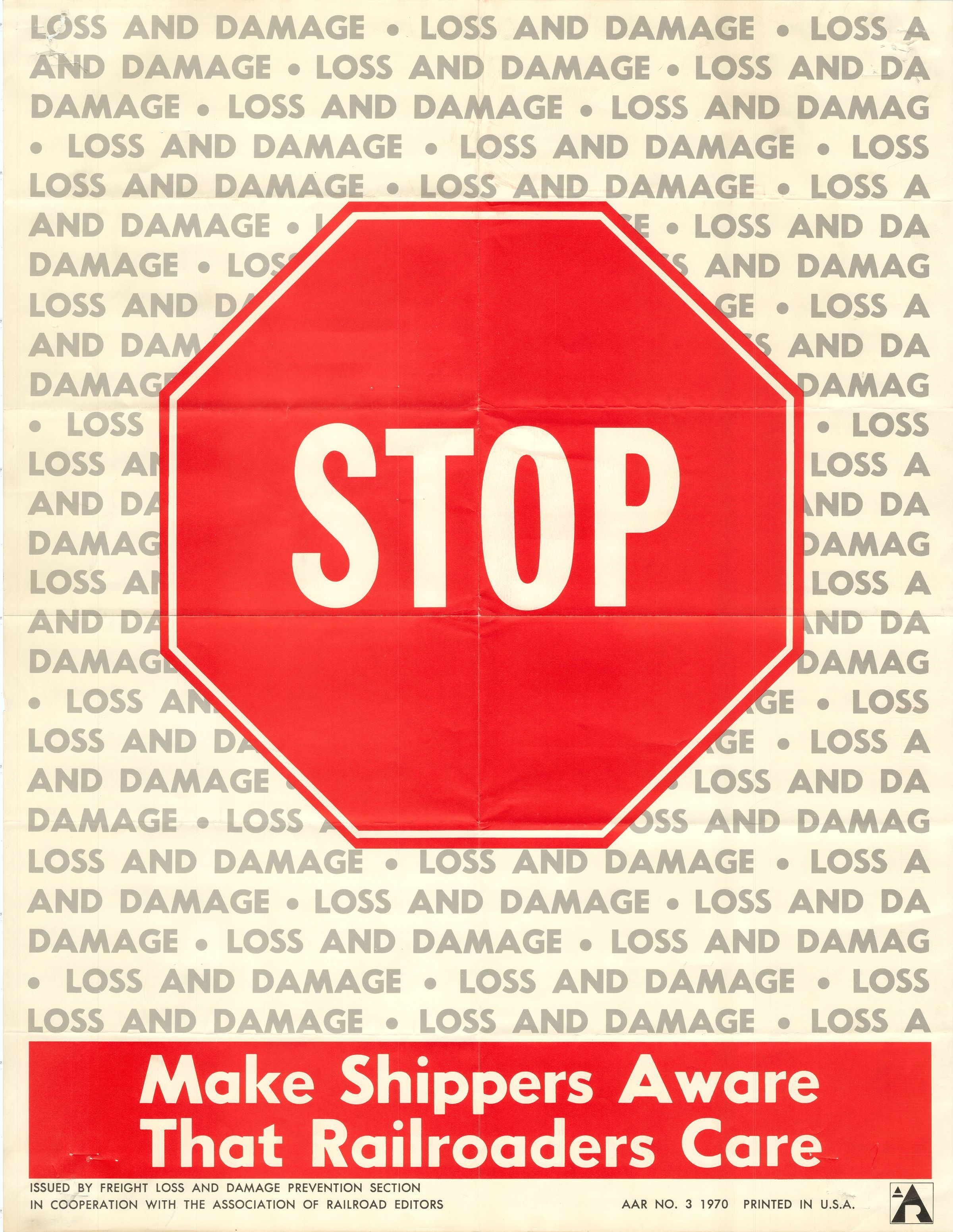 A poster telling railroad employees to reduce instances of freight damage and loss, 17" x 22," 1970. The poster was issued by the Freight Loss and Damage Prevention Section and Association of Railroad Editors, for the Association of American Railroads (AAR). The poster has a large red stop sign in the center, with gray lettering repeatedly stating "Loss and Damage" in the background. "Make Shippers Aware That Railroaders Care" is stated at the bottom of the poster, in a red banner.