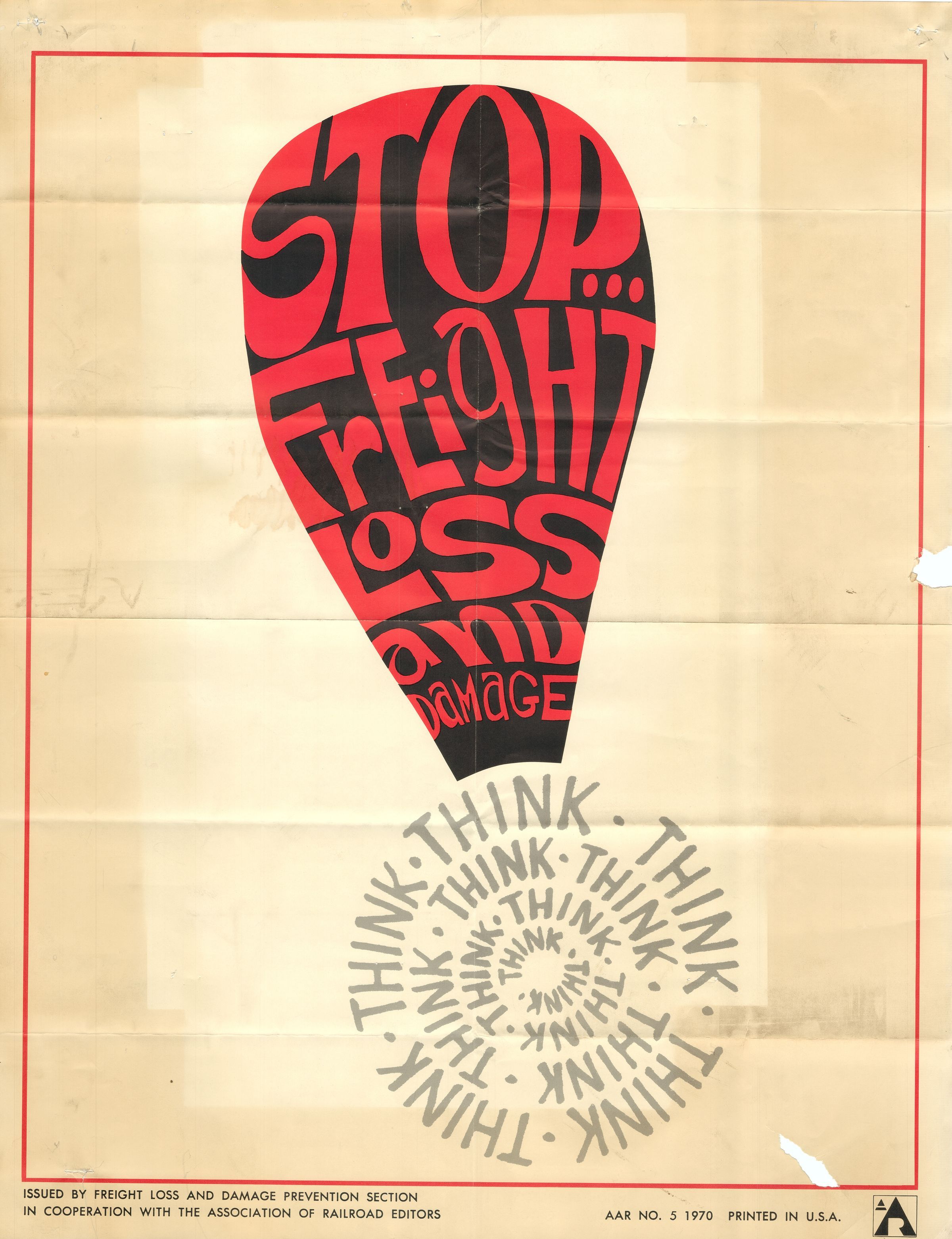 A poster telling railroad employees to reduce instances of freight damage and loss, 17" x 22," 1970. The poster was issued by the Freight Loss and Damage Prevention Section and Association of Railroad Editors, for the Association of American Railroads (AAR). A large mosaic image of an exclamation mark made up of wording takes up the whole poster. The message within the image reads, "Stop Freight Loss and Damage," with the word "Think" in gray lettering repeated in a circular pattern for the exclamation mark's lower dot.
